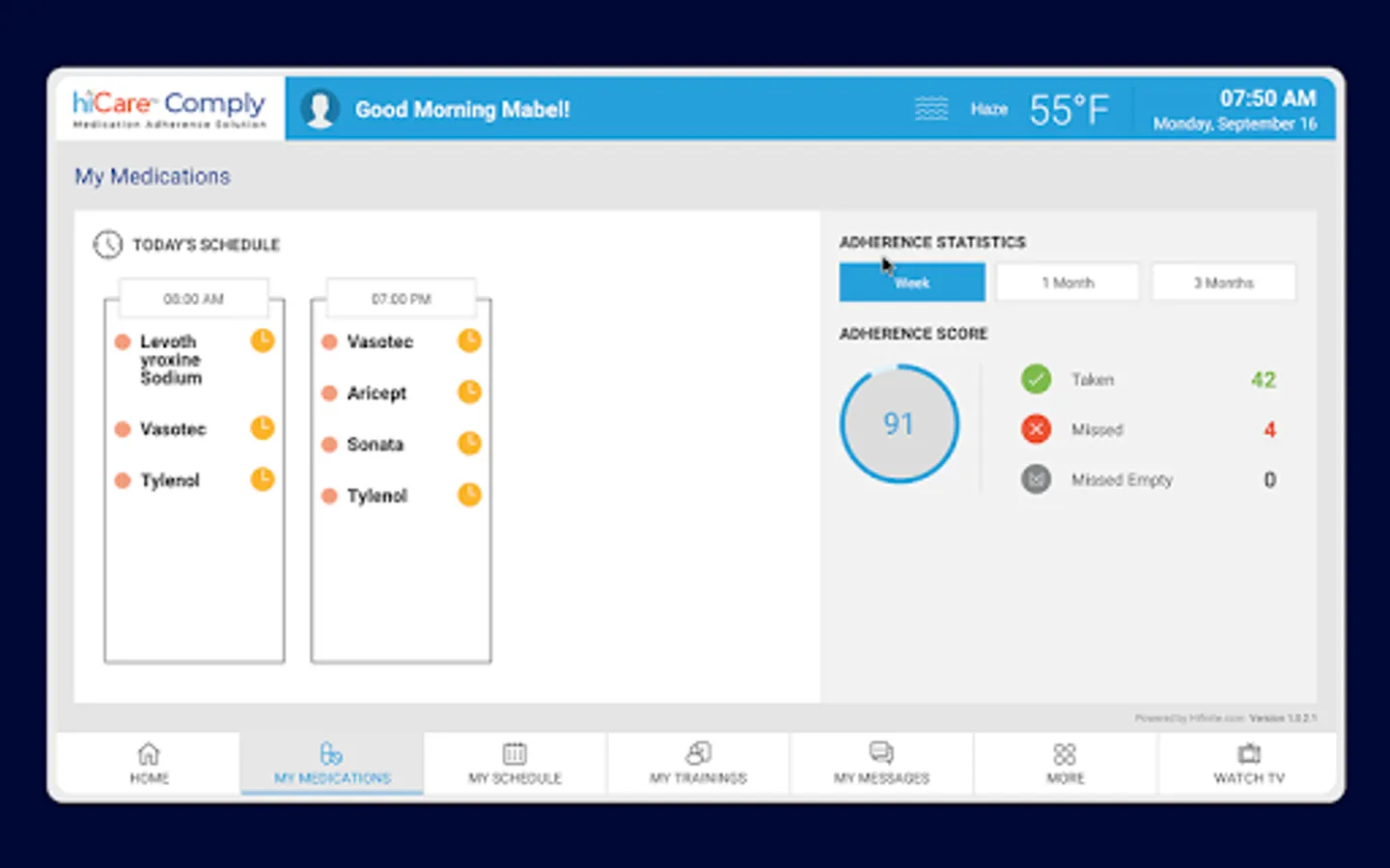 • hiCare Comply app works on a tablet and is integrated with a smart pillbox.