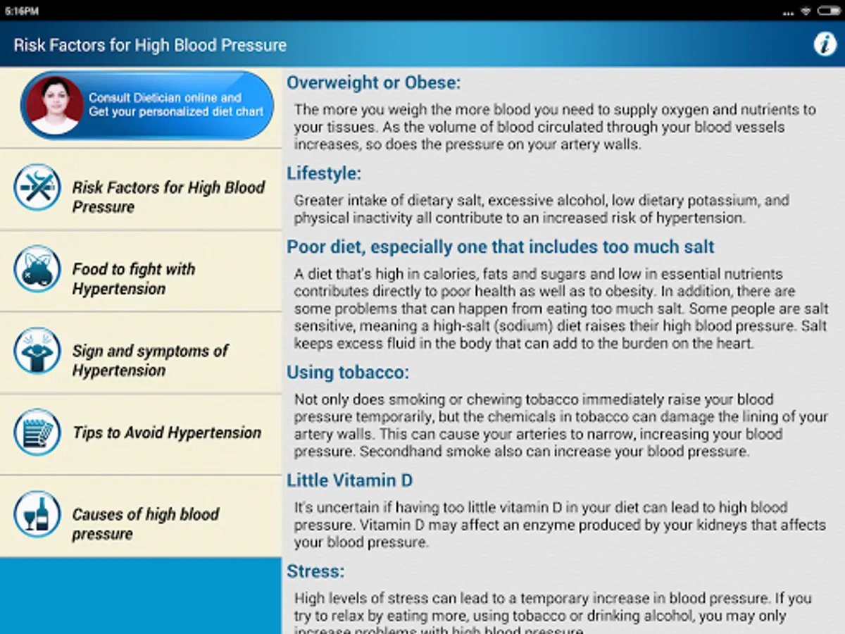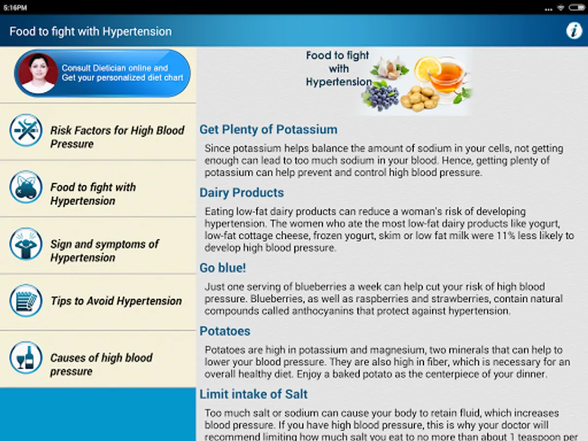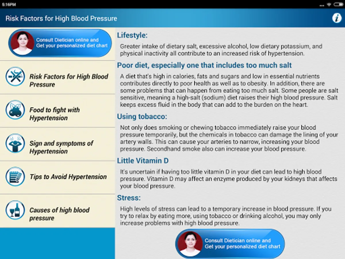 High Blood Pressure Diet Tips is a Free App specially designed for High BP Help Tips and awareness for Hypertension Patients. App covers information about High Blood Pressure Hypertension such as Types causes risk factors friendly foods and foods to avoid etc. Dieting ideas and tips of this app have been carefully reviewed by Experienced and professional dietitians carefully.