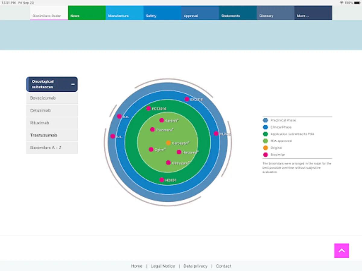 The "Biosimilar-Radar" section of V1.0 is limited to the oncological therapeutics and also presents the reference product there. In addition to approval status and effectiveness data, safety data are also presented. This gives you quick and uncomplicated access to relevant data - of course with relevant literature quoted and a detailed list of references.