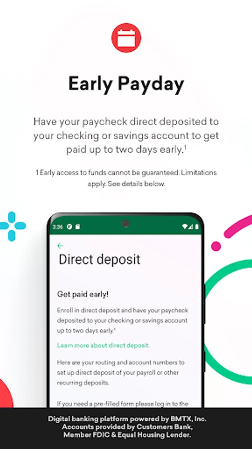1 Funds from payroll-related direct deposits may be made available up to two days early. Early access to payroll deposits applies to the direct deposit of funds from your employer. Employer direct deposits vary and, as a result, it is not possible to guarantee early access to your pay. Factors that will affect this include the sender’s deposit description used and the timing of their submission of deposit. In order to provide this service, we generally post such deposits on the business day we receive notice that the deposit is scheduled, which may be up to two (2) business days earlier than the payer’s scheduled payment date. In general, benefit checks (direct deposit or otherwise) from the federal or state government will not be eligible for early access based on the parameters we use. As an example, benefits that generally would not receive early access include but are not limited to unemployment, retirement, pension, civil service, railroad retirement and veteran’s payments.