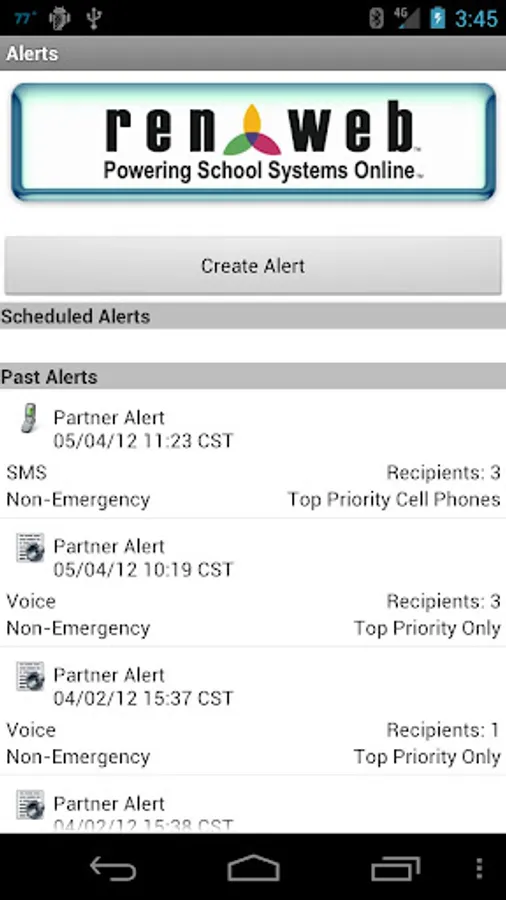 The Parent Alert App allows users to send emergency alerts from school, home, or on the road without accessing a computer. There is no need to worry about the electricity or Internet being out of service - alerts can be sent directly from a smartphone or tablet to the device of choice for parents, students, and staff. Schools must be signed up for Parent Alert to send alerts. For more information, go to RenWeb Main Menu > Report Manager > Products & Services > Parent Alert – Sign Up > Print.
