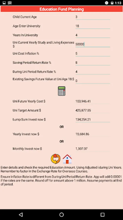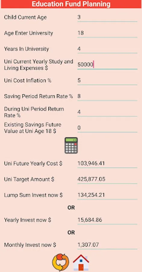 o) Calculate yearly Education investment amount required based on current fees, inflation and investment returns.