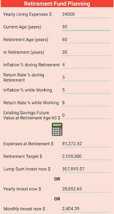 n) Calculate yearly Retirement investment amount required based on current expenses, inflation and investment returns.