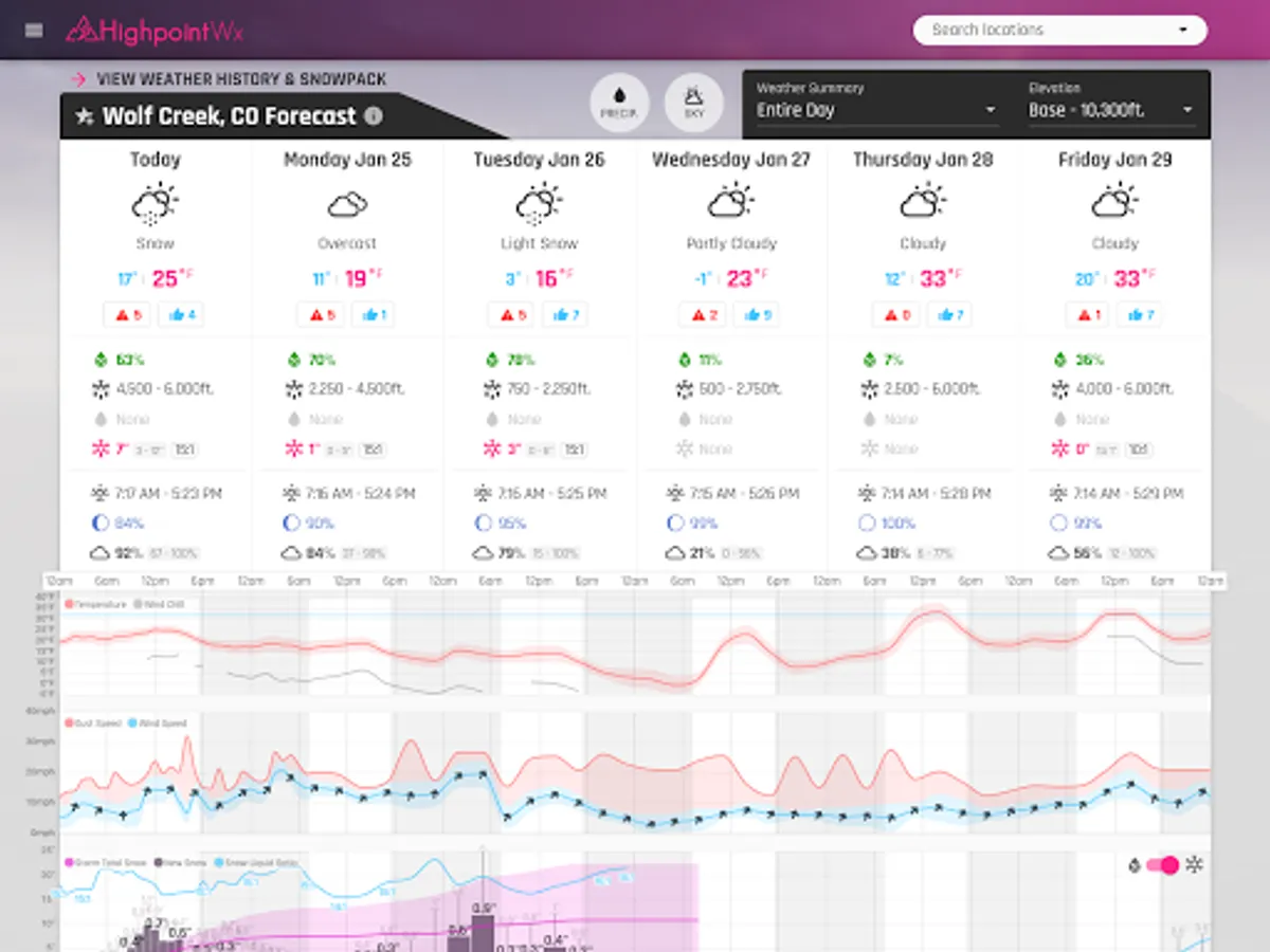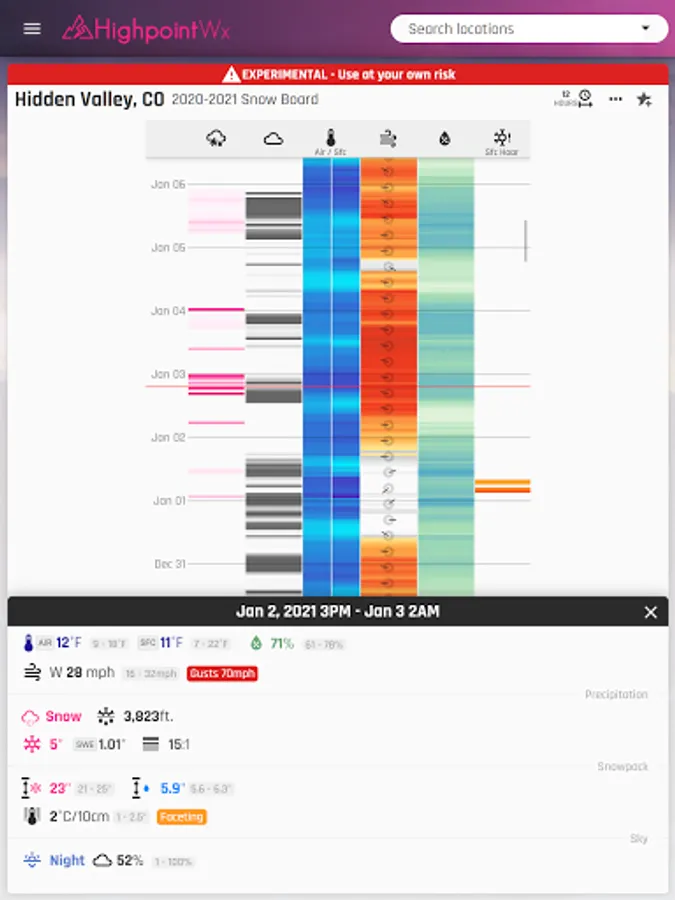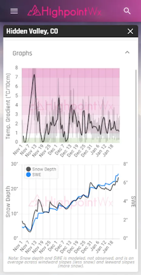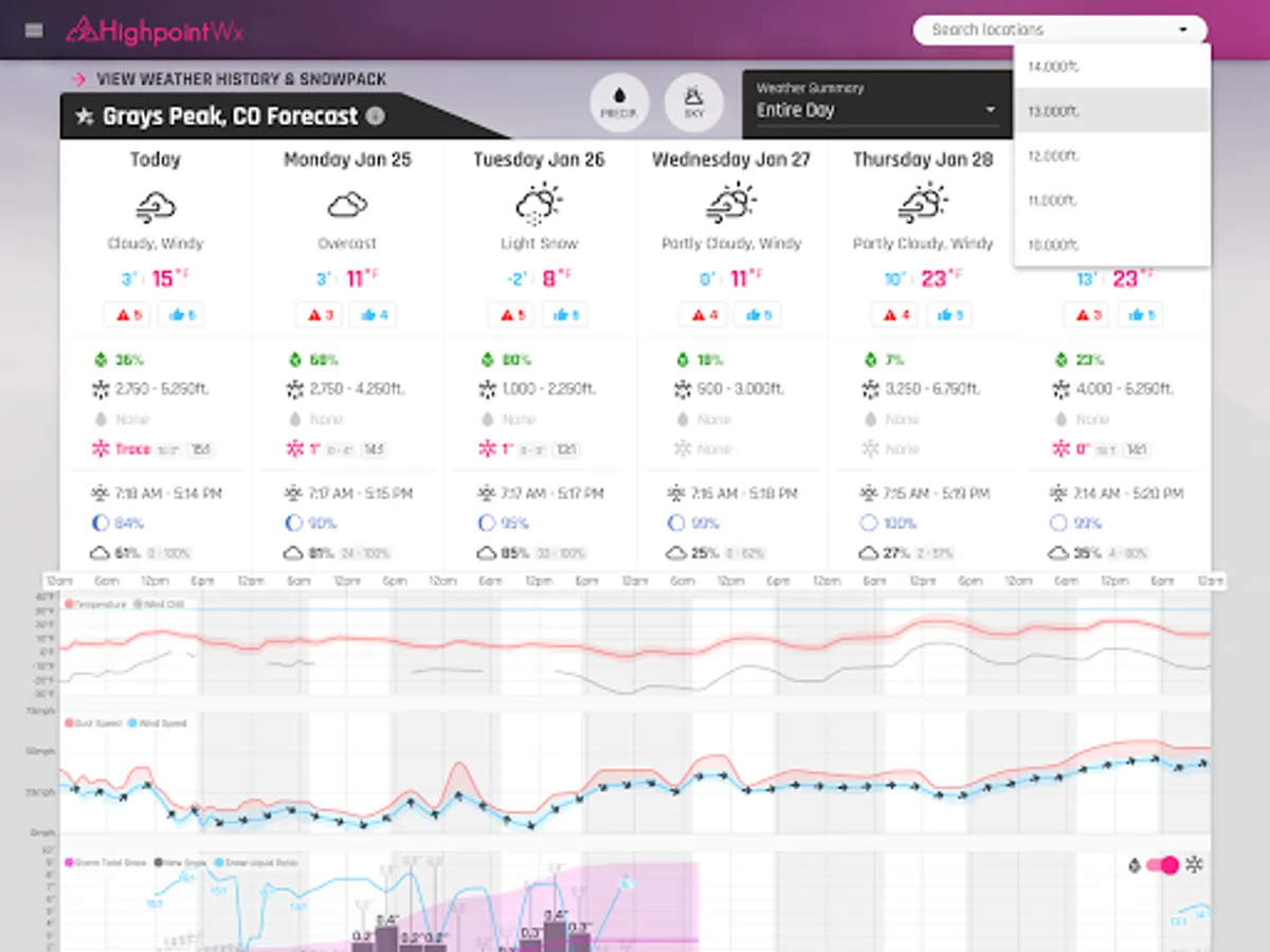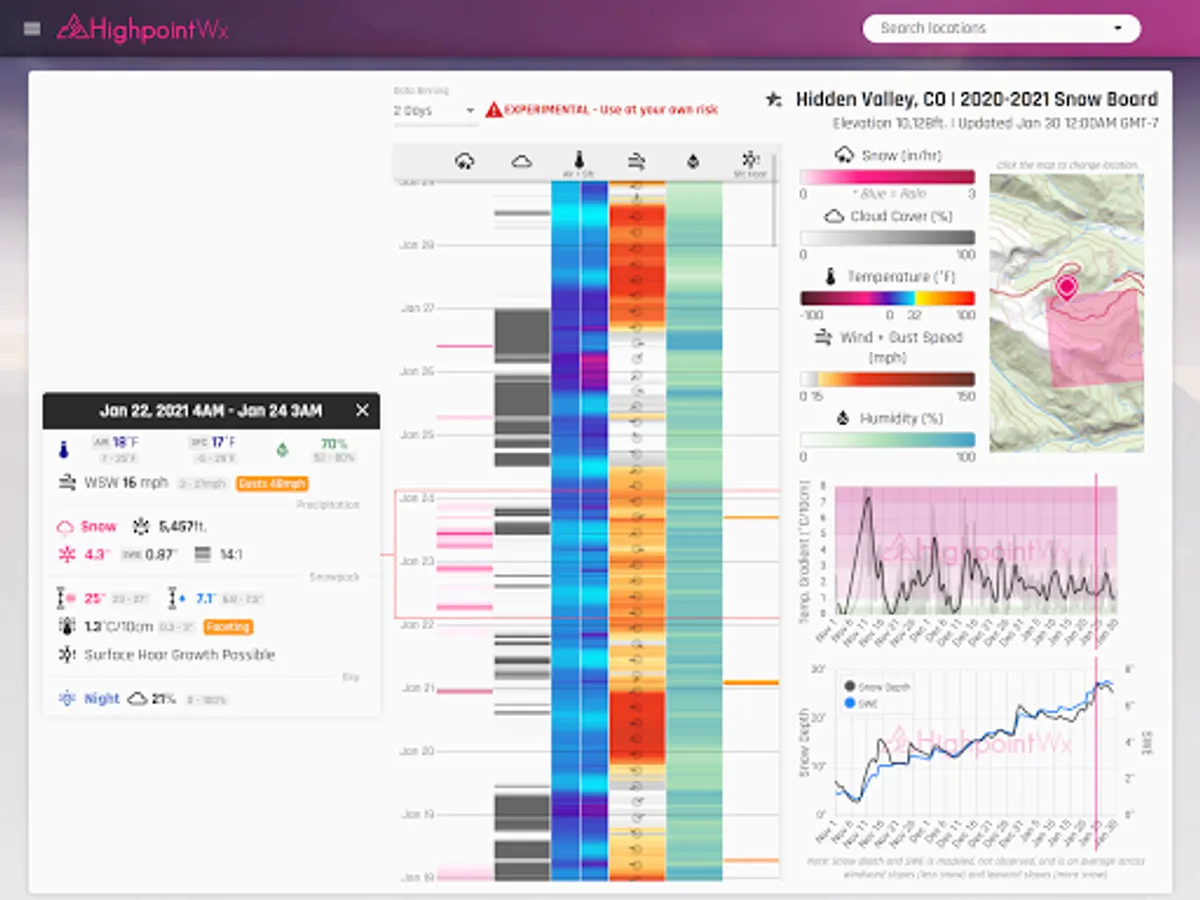 The Highpoint Weather app provides high resolution, hourly forecasts for the state of Colorado and the surrounding area, in addition to backcountry recreation tools such as snowpack history, snow metamorphosis, and detailed weather data going back to the start of the season for any location. The interface and weather forecasting data was designed to be most useful for outdoor recreationalists, whether you're a skier, backcountry splitboarder, mountain biker, ice climber, mountaineer, trail runner, or whitewater rafter.