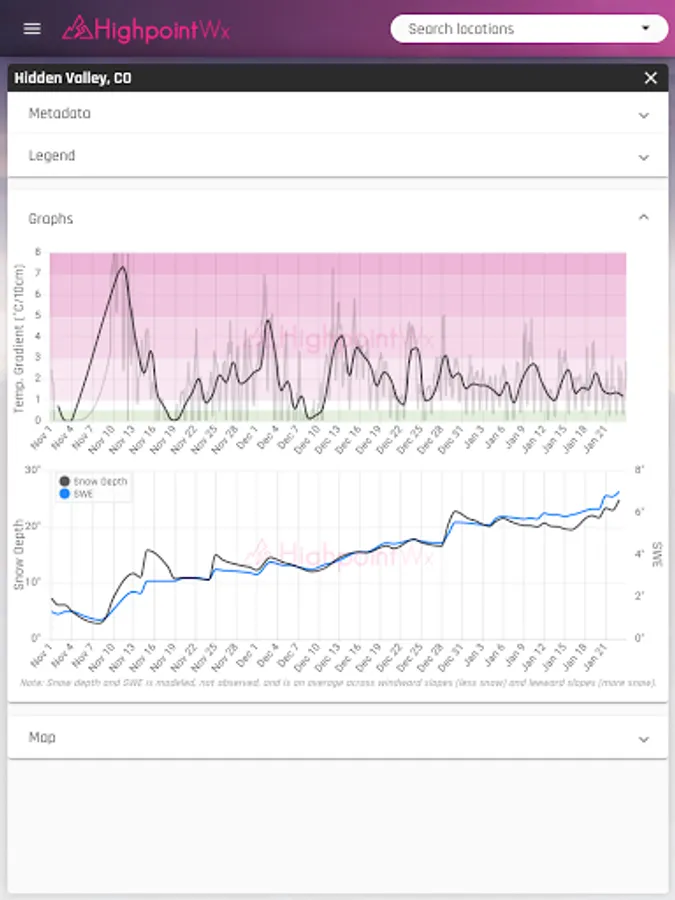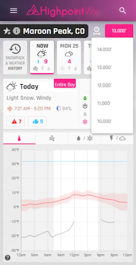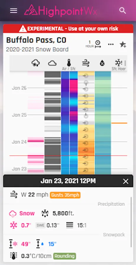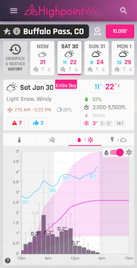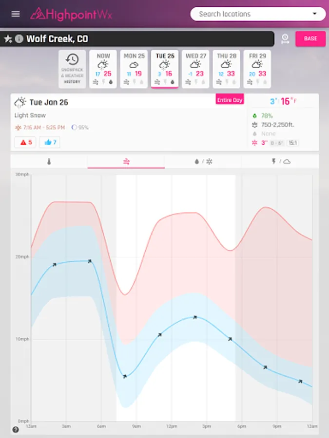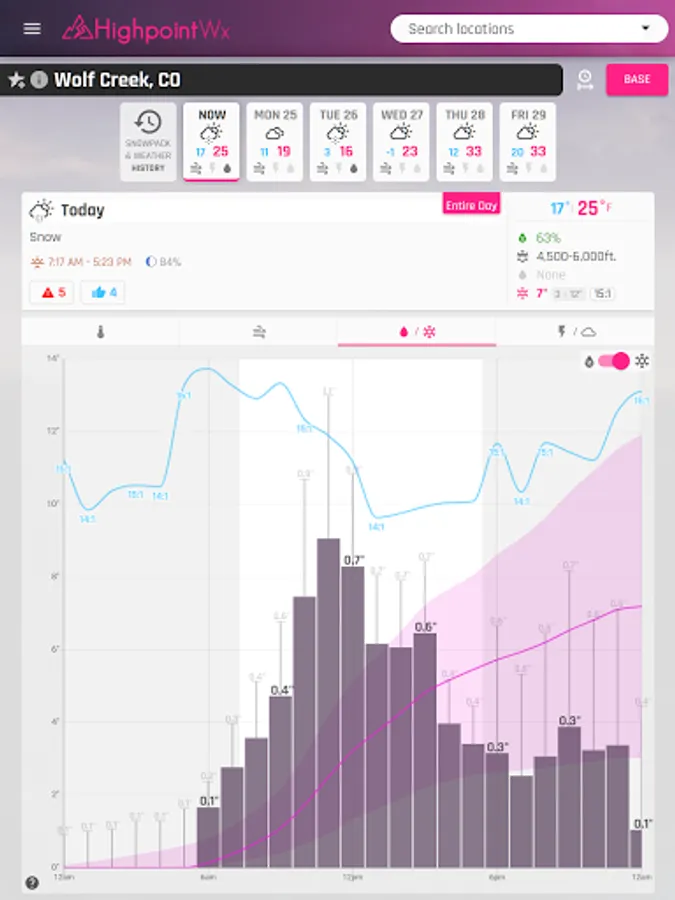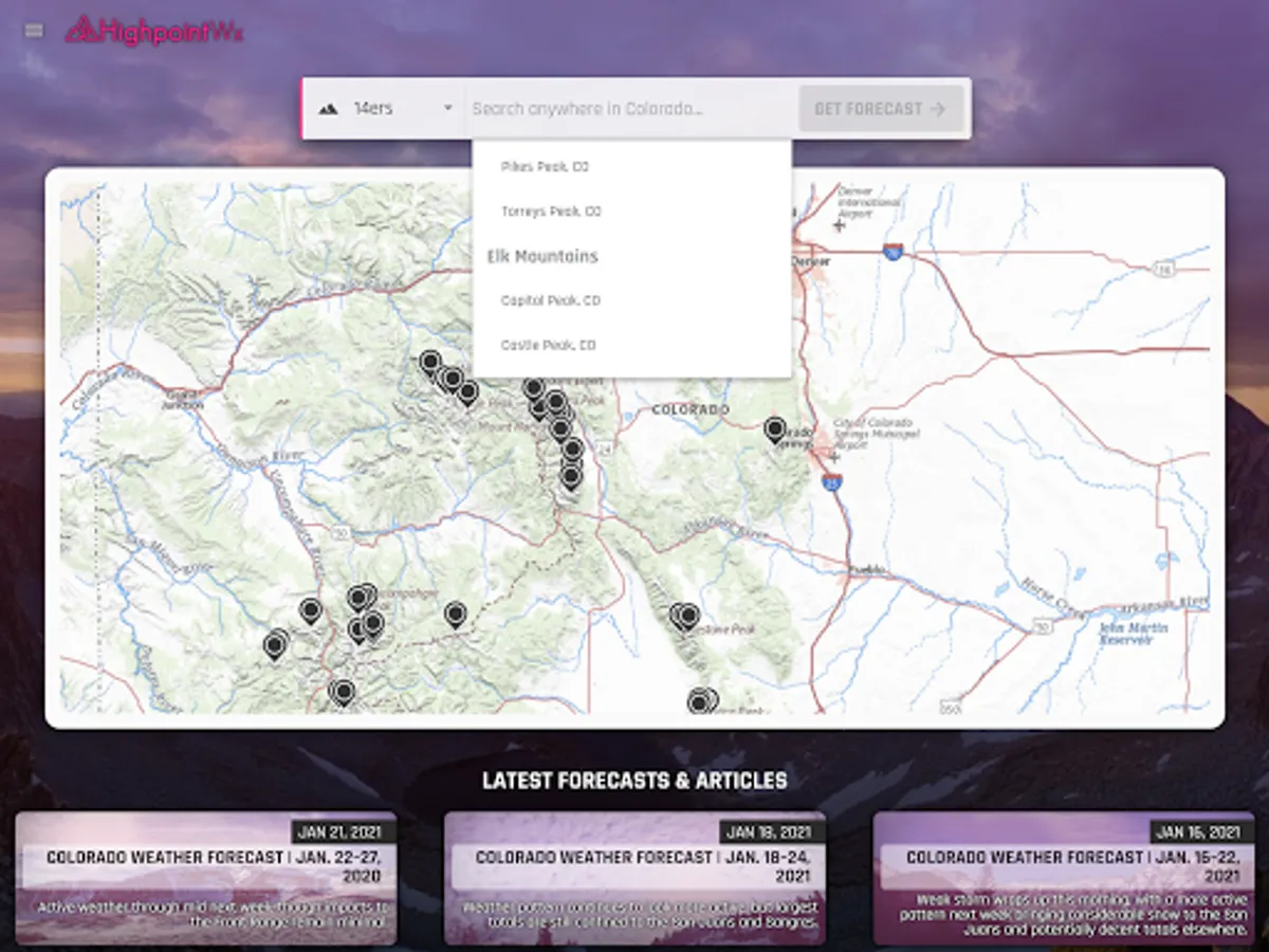 The Highpoint Weather app provides high resolution, hourly forecasts for the state of Colorado and the surrounding area, in addition to backcountry recreation tools such as snowpack history, snow metamorphosis, and detailed weather data going back to the start of the season for any location. The interface and weather forecasting data was designed to be most useful for outdoor recreationalists, whether you're a skier, backcountry splitboarder, mountain biker, ice climber, mountaineer, trail runner, or whitewater rafter.