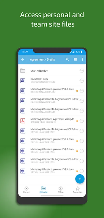 • Access your own files, as well as documents stored on other team sites, even those with restricted access.