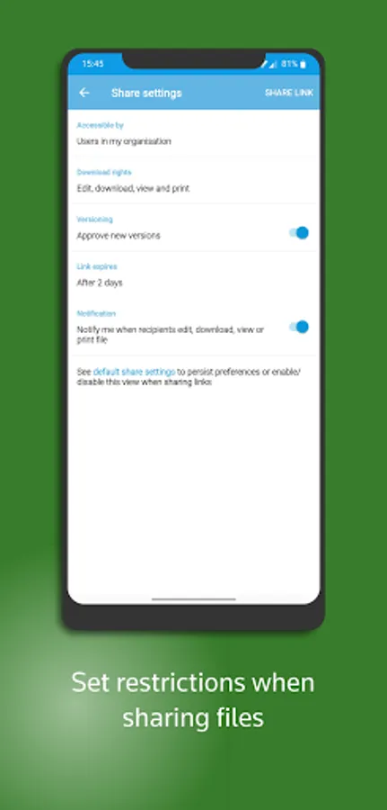 • Share secure links to files and apply recipient restrictions, including passwords and expiry dates.