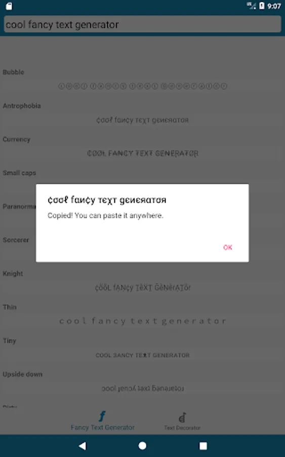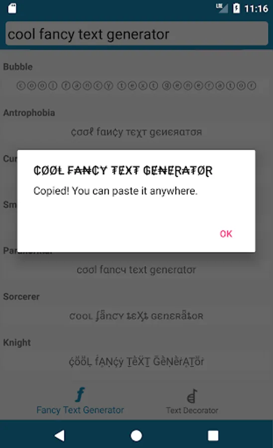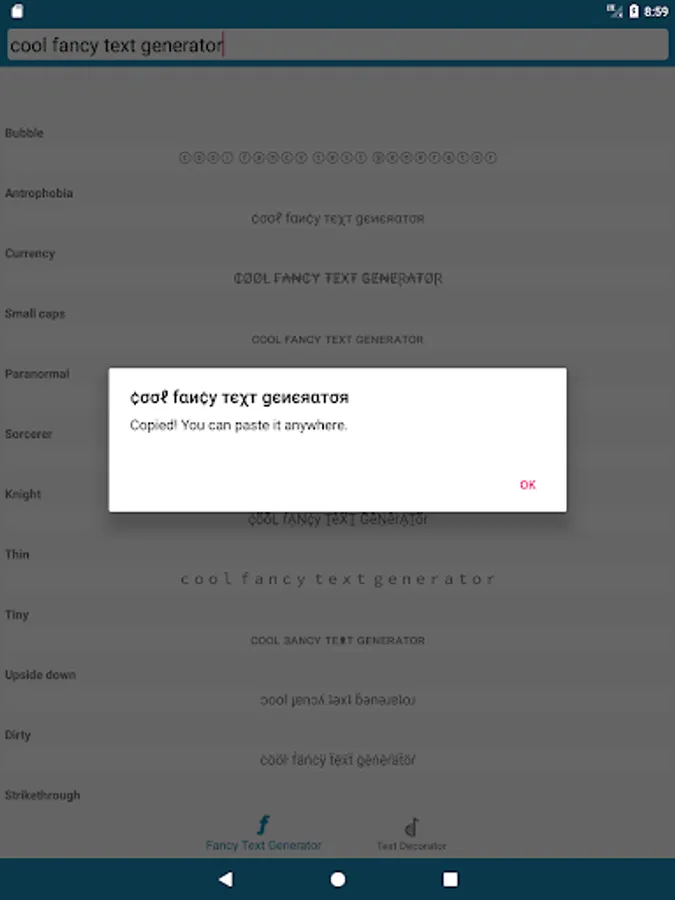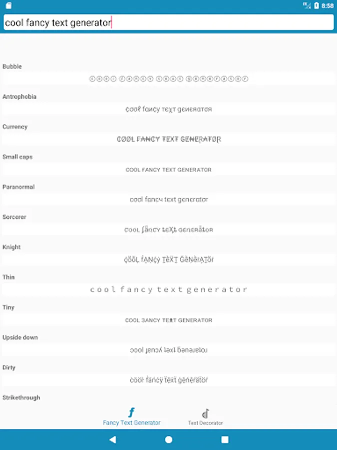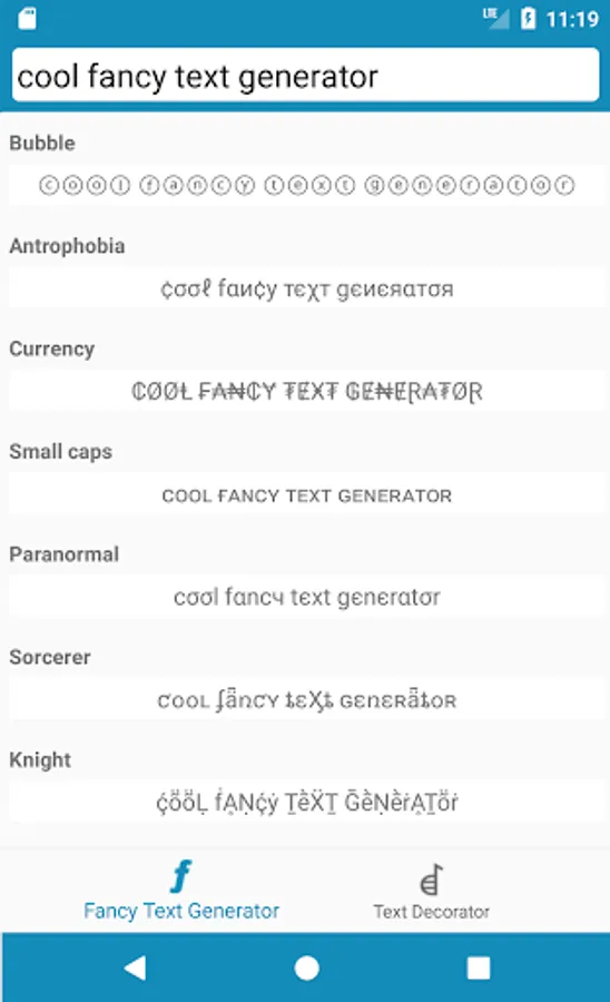 Cool Fonts is a handy tool that helps convert normal text to different stylish cool text, thus it helps create text with cool symbol and fancy font. Basically, it is a word art generator, letter generator, font generator... to generate cool letters, fancy message, text symbols, cool symbols, fancy writing,.. This cool font app is useful for Instagram, Facebook, Twitter, Whatsapp, Snapchat, Tiktok, ...