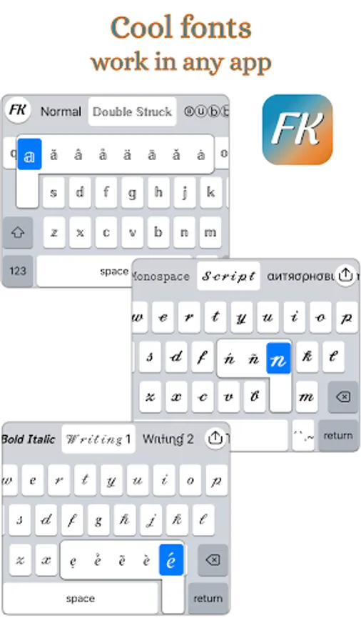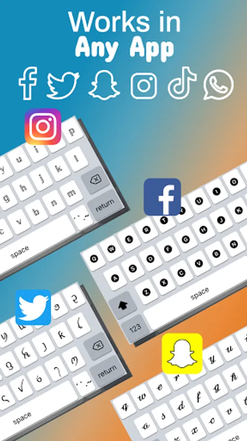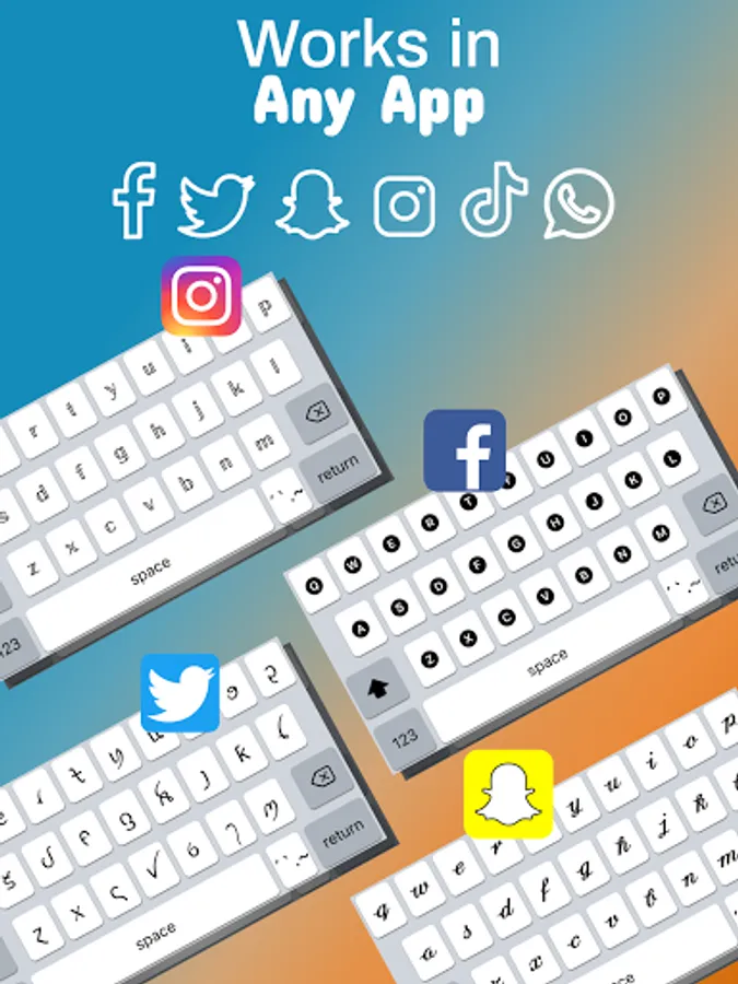 This Font Keyboard app provides an easy way to get beautiful cool fonts for all the apps on your phone. This is useful for chat messages, bio, status, tweet,... Using this custom fonts keyboard, you have access to around a hundred of fancy and beautiful font styles to choose. This fonts keyboard is absolutely free and easy to use.