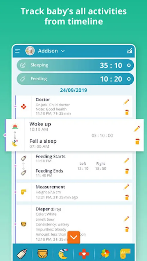 - Track breastfeeding, sleep sessions, body measurements, diaper changes, baby care and growth