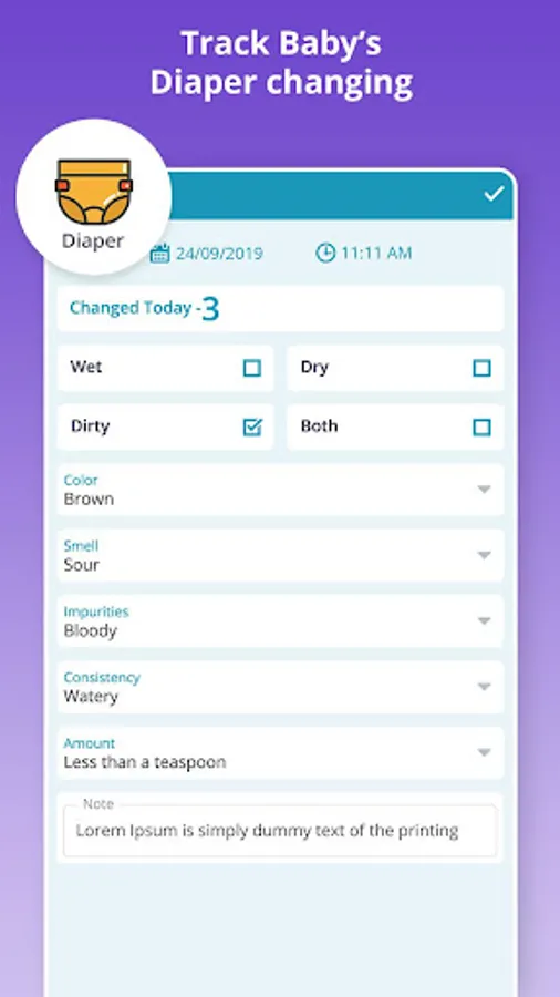 *Baby Care - Newborn Feeding, Diaper, Sleep Tracker app offers to track following parameters: