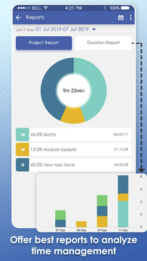 - Offer best reports to analyze time management (Bar Chart, Pie Chart report including date filters)