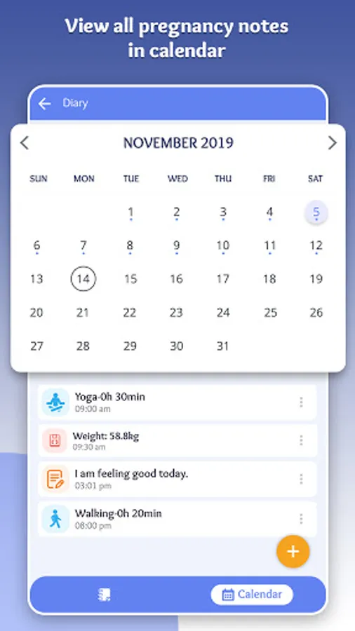 Very useful to log your health like sleep, physical activities, mood, weight, blood pressure and nutrition), personal notes, baby’s first kick and bump photos.