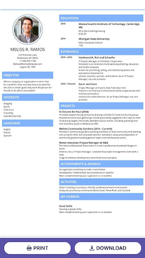 - Resume preview – You can download or print your CV easily