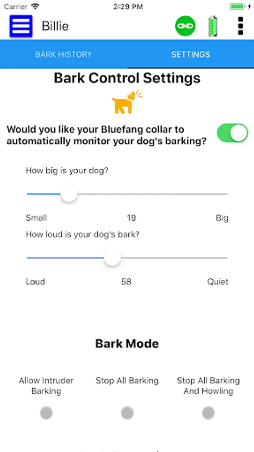 BARK CONTROL: The Bluefang Collar has built in bark control that may be activated and tailored to your dog via the app. Choose from 3 training modes. Normal mode stops all barking. Anti-Intruder mode stops nuisance barking but allows the more excited type of barking your dog exhibits when barking at an intruder or emergency. Anti-Howl mode stops barking and howling.