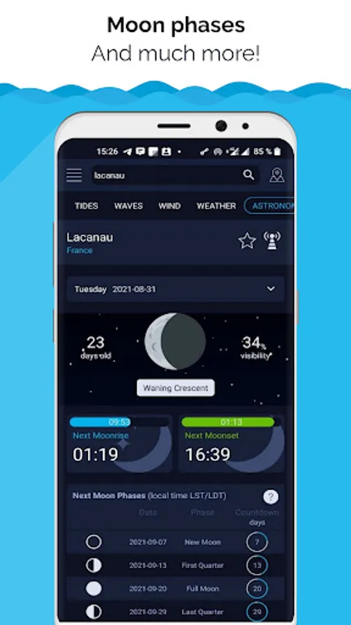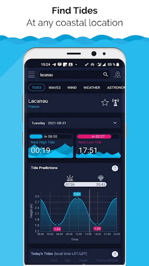 High Tide, Waves & Wind Charts will help you find the tides and wind speed tables near you. It focuses on tide stations and current tidal conditions to give you the most accurate forecast. Check the time of the last and next tide or current, as well as when the sun and moon will rise or set.