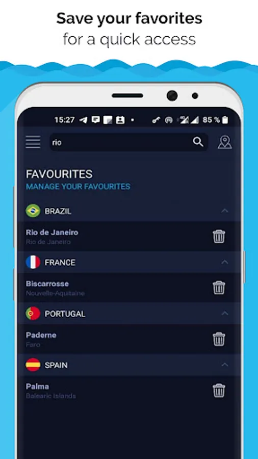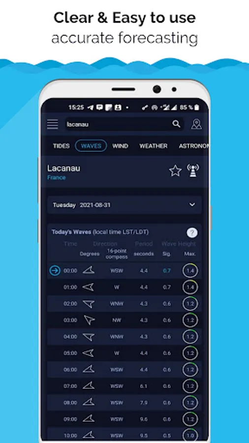 Surfing tablet with waves' height, direction, and wave period with currents graphs. The waves and wind finder will tell you the actual wind and waves forecast for surfing. Know when the best time is for you to go surfing.