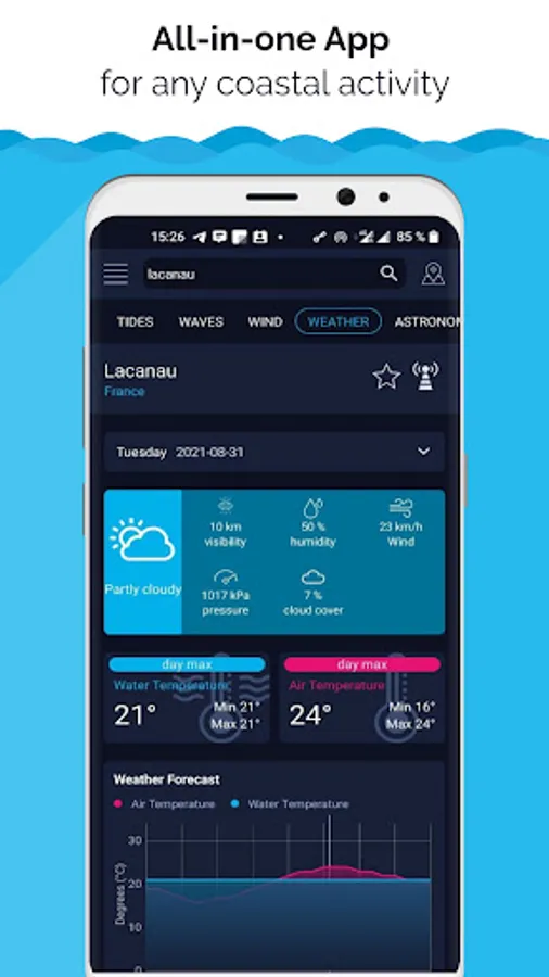 High Tide gives you a fully automated tide table with charts, predictions and alerts. It also gives you the forecast for wind, waves and weather.
