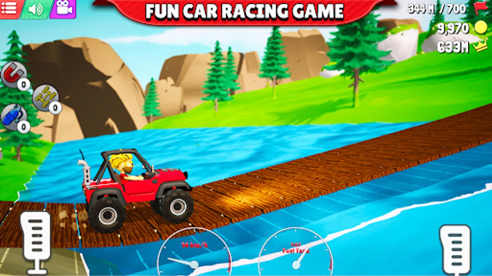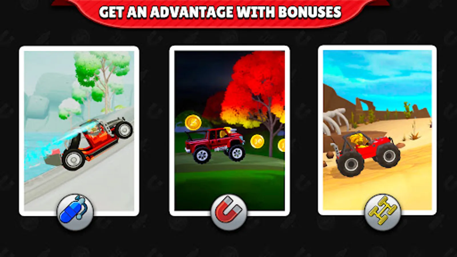 There are 3 different bonus features that you can buy when starting the game. By purchasing nitro, you can climb difficult slopes in a snap. With the magnet feature, you will continue to collect coins while somersaulting in the air. Also purchase the other bonus feature to enlarge your wheels and improve handling.