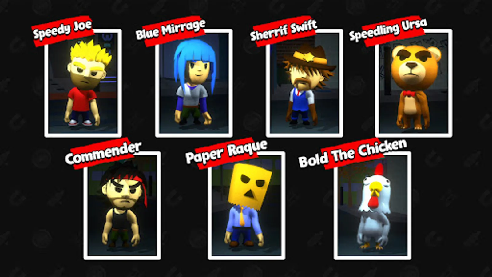7 Different characters are waiting for you in the game. Speedy Joe, Blue Mirage, Sheerif Swift responsible for everyone's safety, our fast and furious teddy bear Speedling Ursa, Paper Rague, athletic Commander, our confused chicken Bold The Chicken.