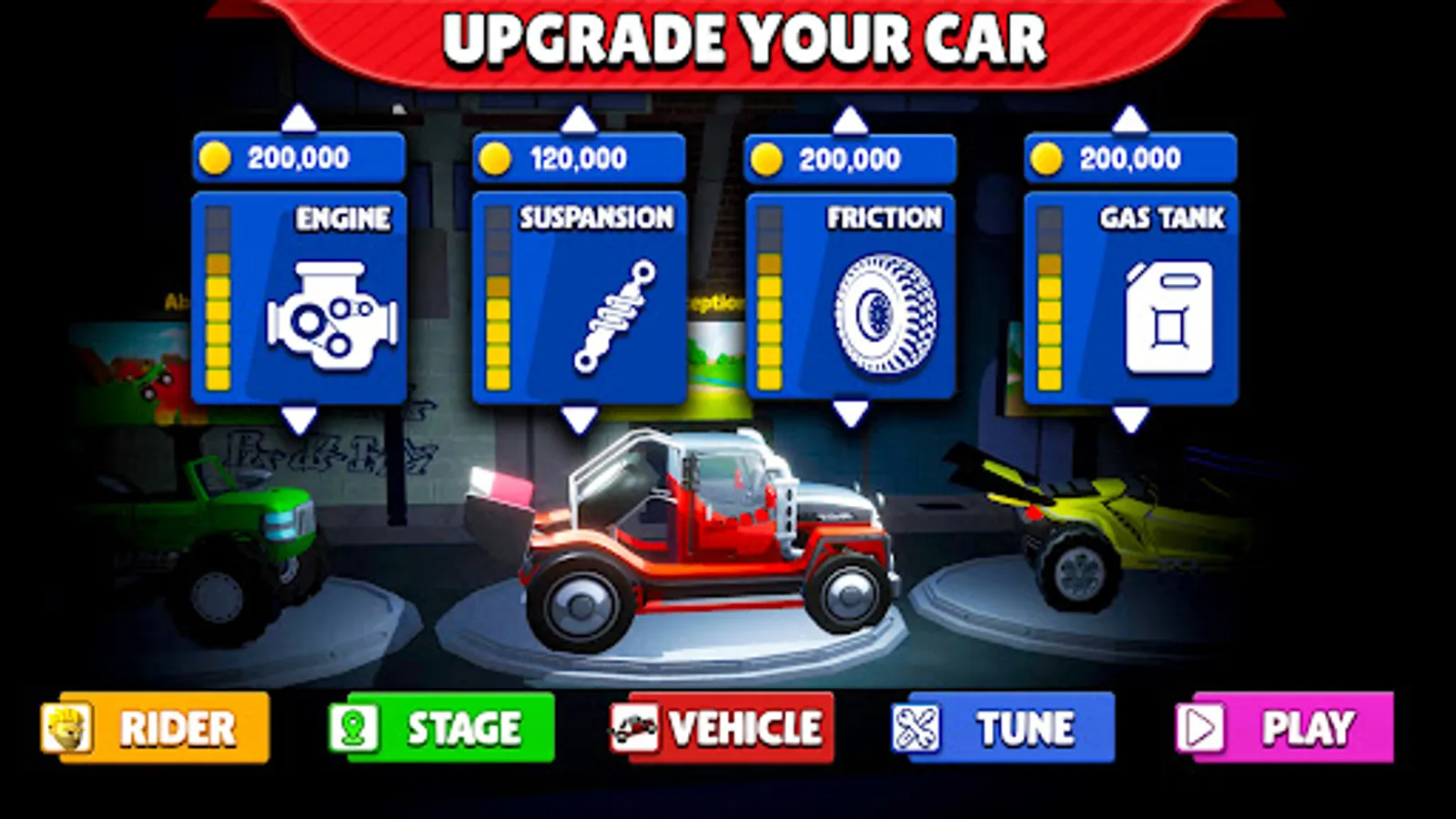 When you click on the settings section of the game, you will be presented with 4 menus to upgrade your vehicle. Engine, Suspension, Friction and Gas Tank. Increase your engine power with the engine. Increase the elasticity of the suspension with the suspension. Strengthen the grip of your wheels with Friction. Increase the volume with your Gas Tank.