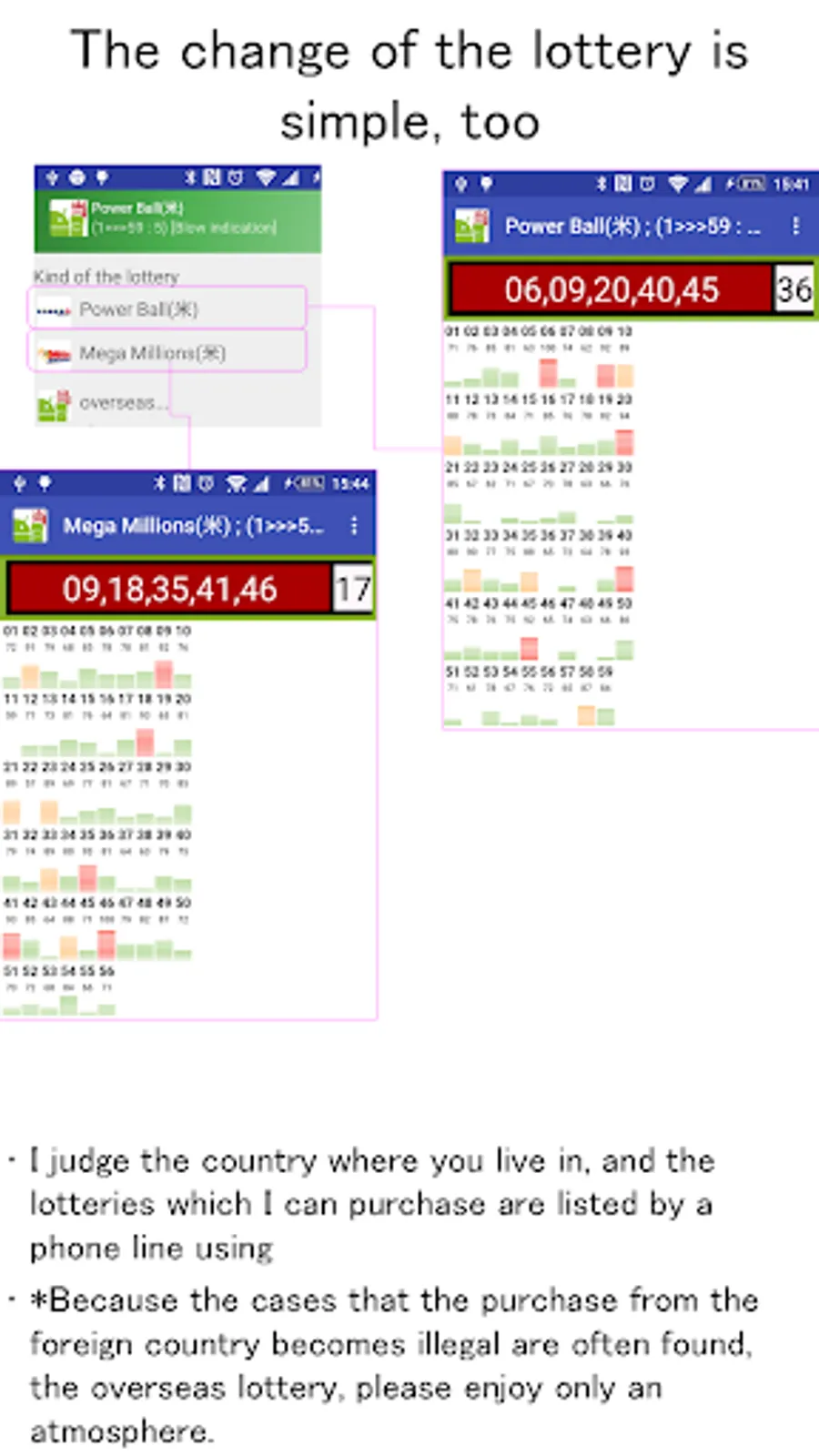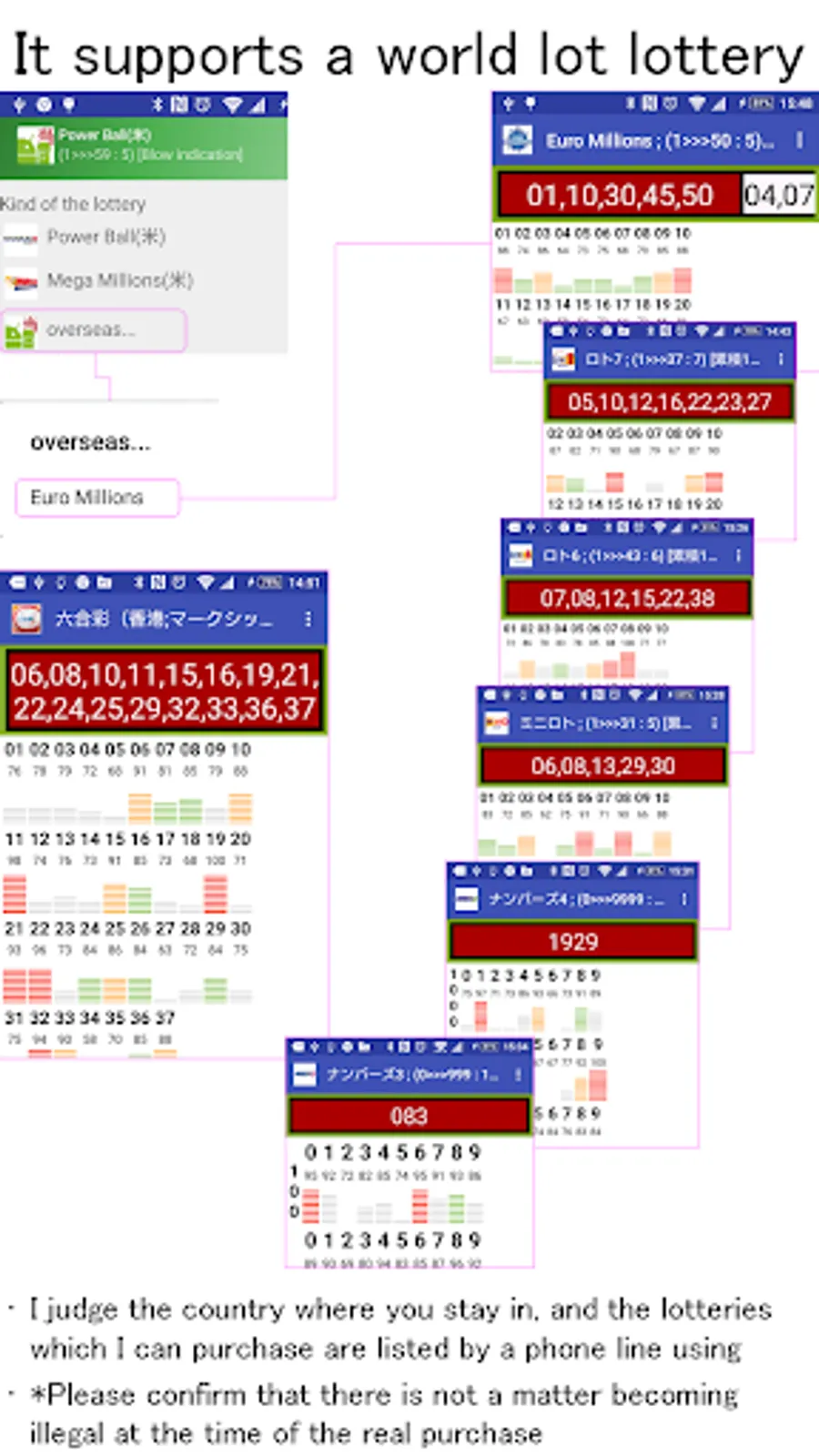 I judge it which country you are in by the line of a cell-phone using and a language using now and display only the lottery which I can purchase then