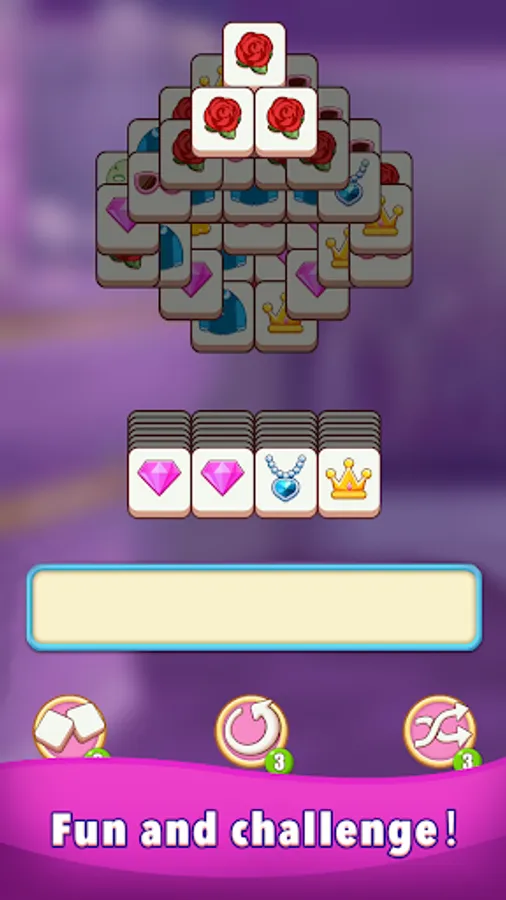 Match tiles of identical patterns (Pick three same tiles!), clear all the tiles to win.