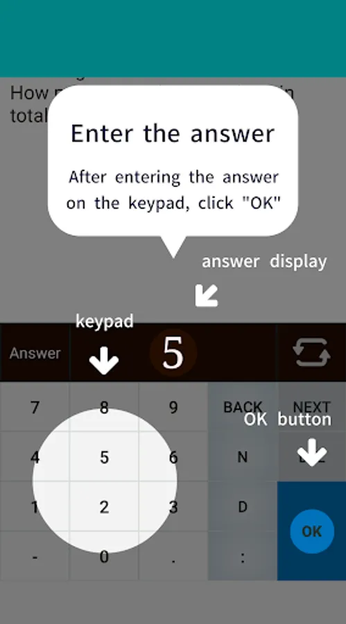 The problem appears in the upper half, so you can enter the answer with the numeric keypad, symbol input buttons, etc. of the lower half.
