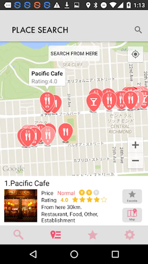 - The price range of the locations are color coded. In addition, ratings (1.0 to 5.0) are also shown if available.