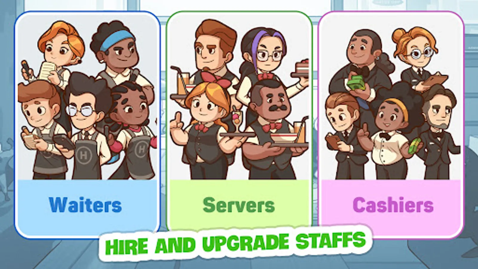- Hire, train, and upgrade chefs and waiters to maximize your profit.