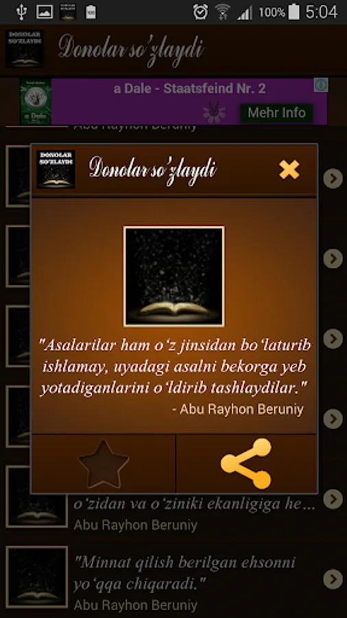 Ushbu ilova buyuk donishmandlar fikrlari va o'gitlarini sizning android mobil qurilmangizda doim sizga hamroh bo'lishini ta'minlash maqsadida yaratildi.