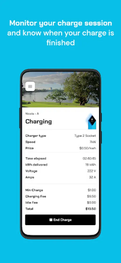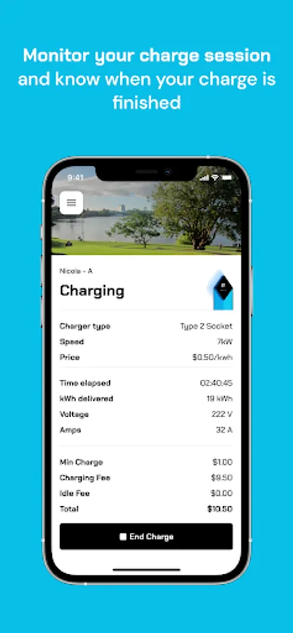 • Monitor you charging session with real time data such as time elapsed, pricing and kWh delivered and more