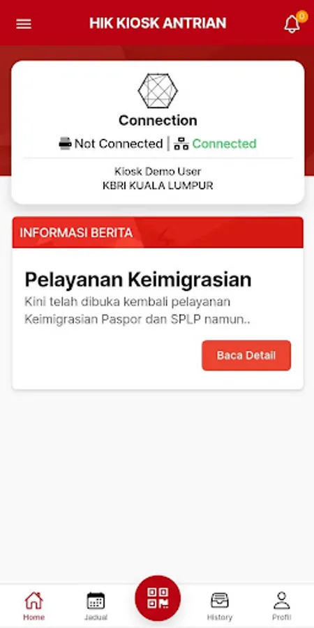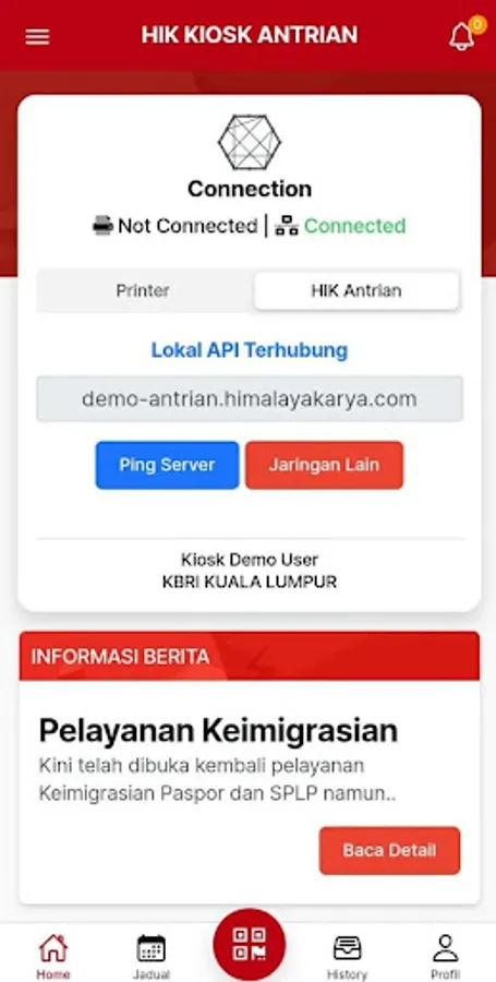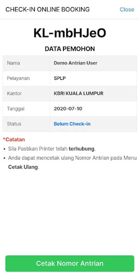This application serves to trim the requestor queue that is so long, making it easy for applicants to queue in the Check-in process to get the queue number in the Service environment without having to come to the Number Kiosk printing device. Officers will be equipped with the Online Queuing Kiosk HIK Application and Bluetooth Printer device, coming to the applicant who is queuing to check-in and provide the queue number.