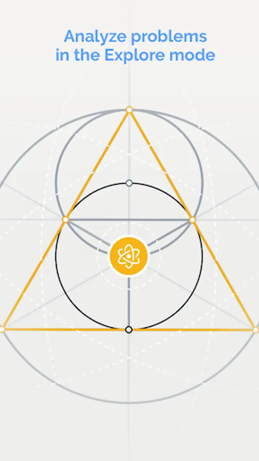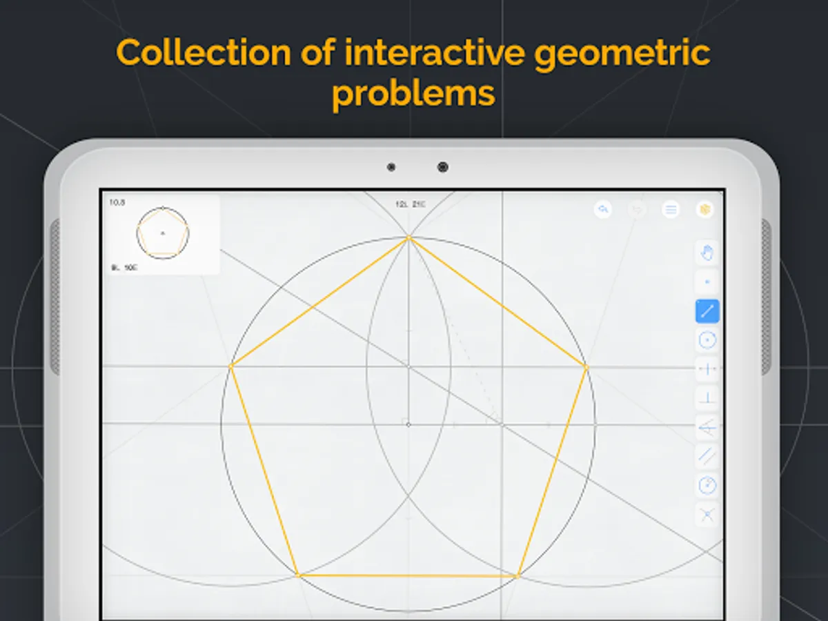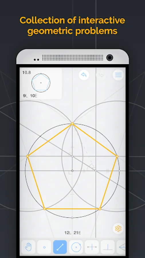 Euclidea-created constructions are completely dynamic. As such, you can drag to adjust angles, lines, radii and so on. You can also easily zoom and pan. This not only makes the experience more interactive, but it allows you to more deeply grasp the relationships between geometric elements, explore various possibilities, and analyze errors.