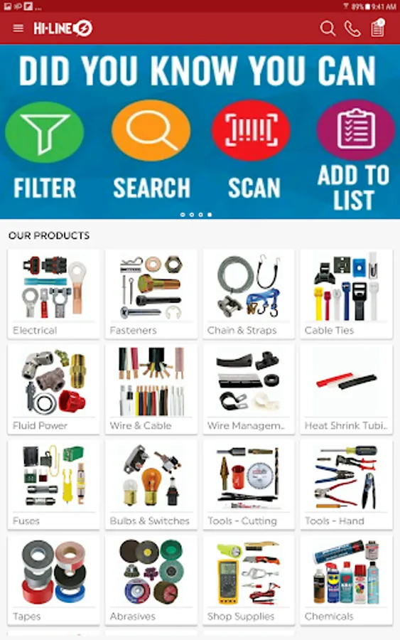 Access to 100,000+ products on-line or off, making it fast and easy to find what you need. Need something now or on our next visit? Scan our Custom Backplates or Yellow Bin Labels to quickly look up parts and add them to your list. All of this, along with our How-to videos and extensive Knowledge Base at your fingertips. Hi-Line is America’s Mobile Industrial Hardware Store®.