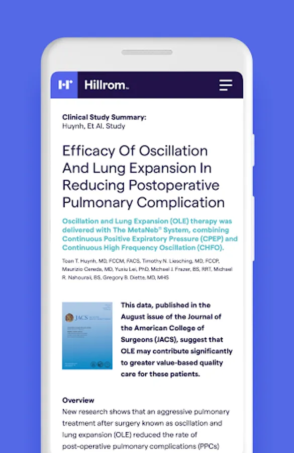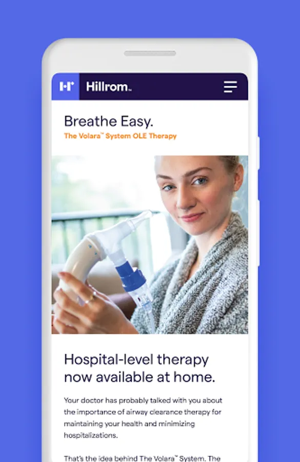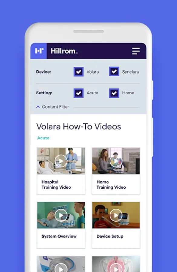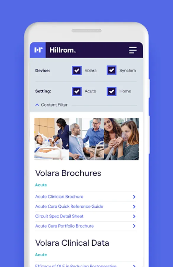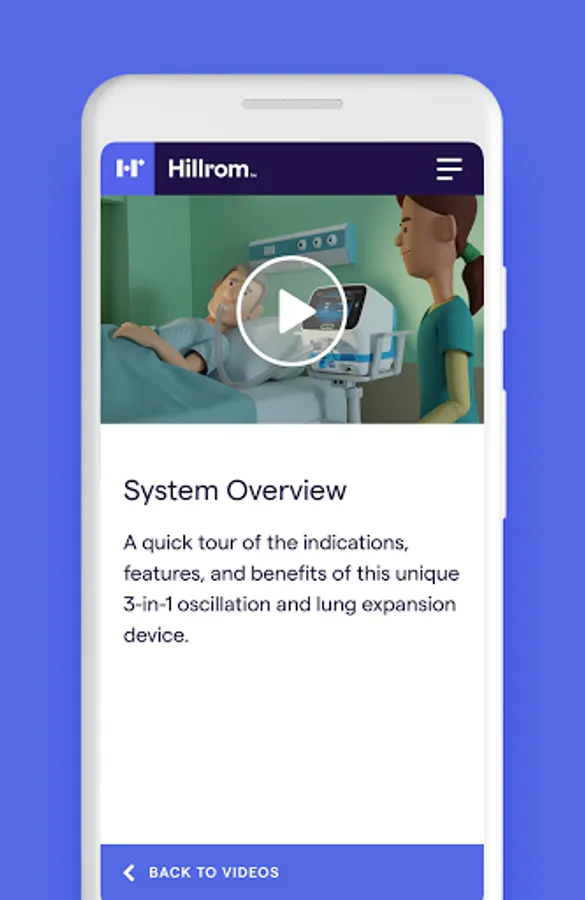 Helpful resources at your fingertips for using the Hillrom Volara™ System for oscillation and lung expansion (OLE) therapy and the Synclara™ Cough System for mechanical insufflation-exsufflation (MIE) therapy. The app is a go-to tool when using these systems for CPEP, CHFO, Nebulizer, and Cough Simulation therapy. From hospital to home, it supports clinicians and caregivers with features that include: