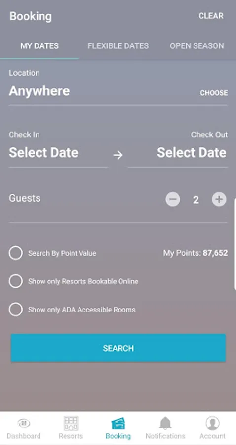 MOBILE BOOKING: Club Members can search for the perfect vacation with our new mobile-friendly booking engine. Choose “My Dates” if you know the exact dates you’d like to travel and only see availability for what you are looking for. If your dates are flexible, choose “Flex” and you can see availability across a range dates, or choose “Open Season” and see just what’s available during the Open Season rental window.