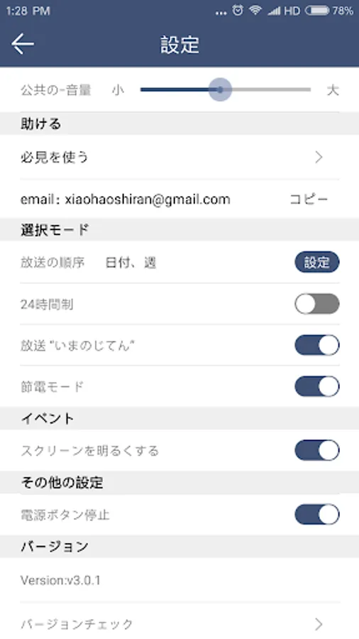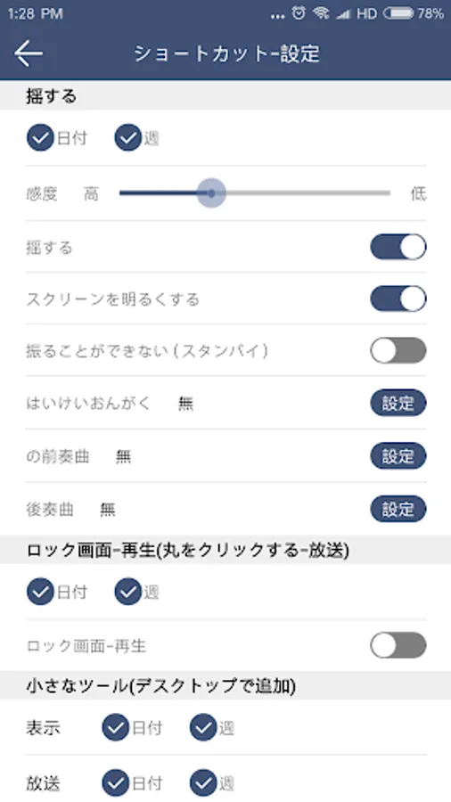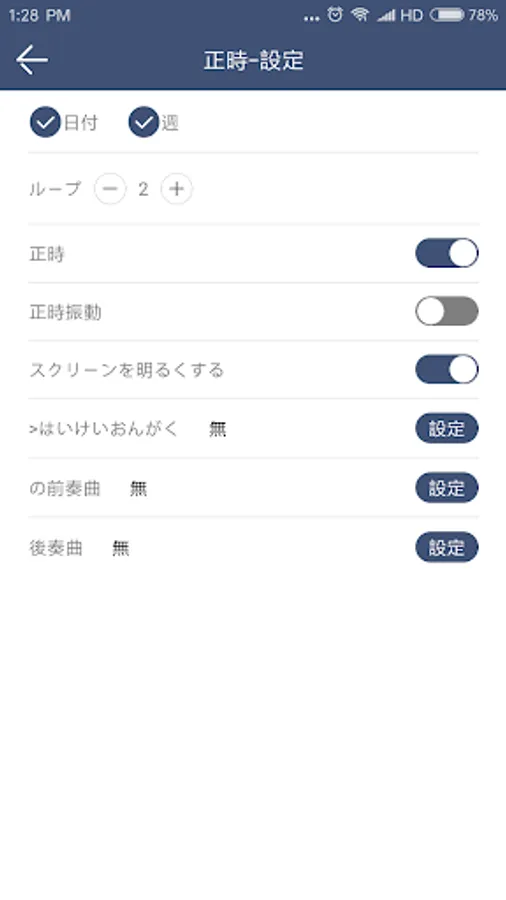 Each type of time signal supports background music, prelude music, and post-performance music, and all times are set to play music.