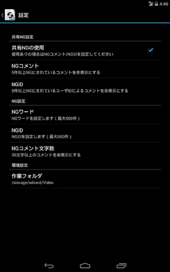 ・NG設定(NGID/NGワード/NGコマンド)は当デベロッパーが開発した他アプリからインポート、もしくは他アプリへエクスポートする事ができます。