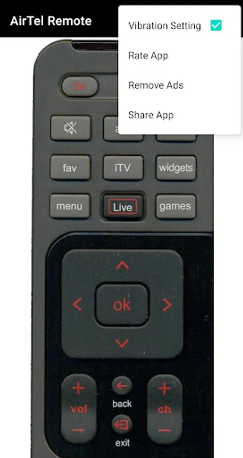 Airtel Remote App consists of 4 types remote ... For all types of setup boxes. Remote for airtel setup box India is easy to use. All remote inside the app is very easy to use. Real life-like remote layout no need to search for buttons inside the app Just use it as the physical remote in your hand.