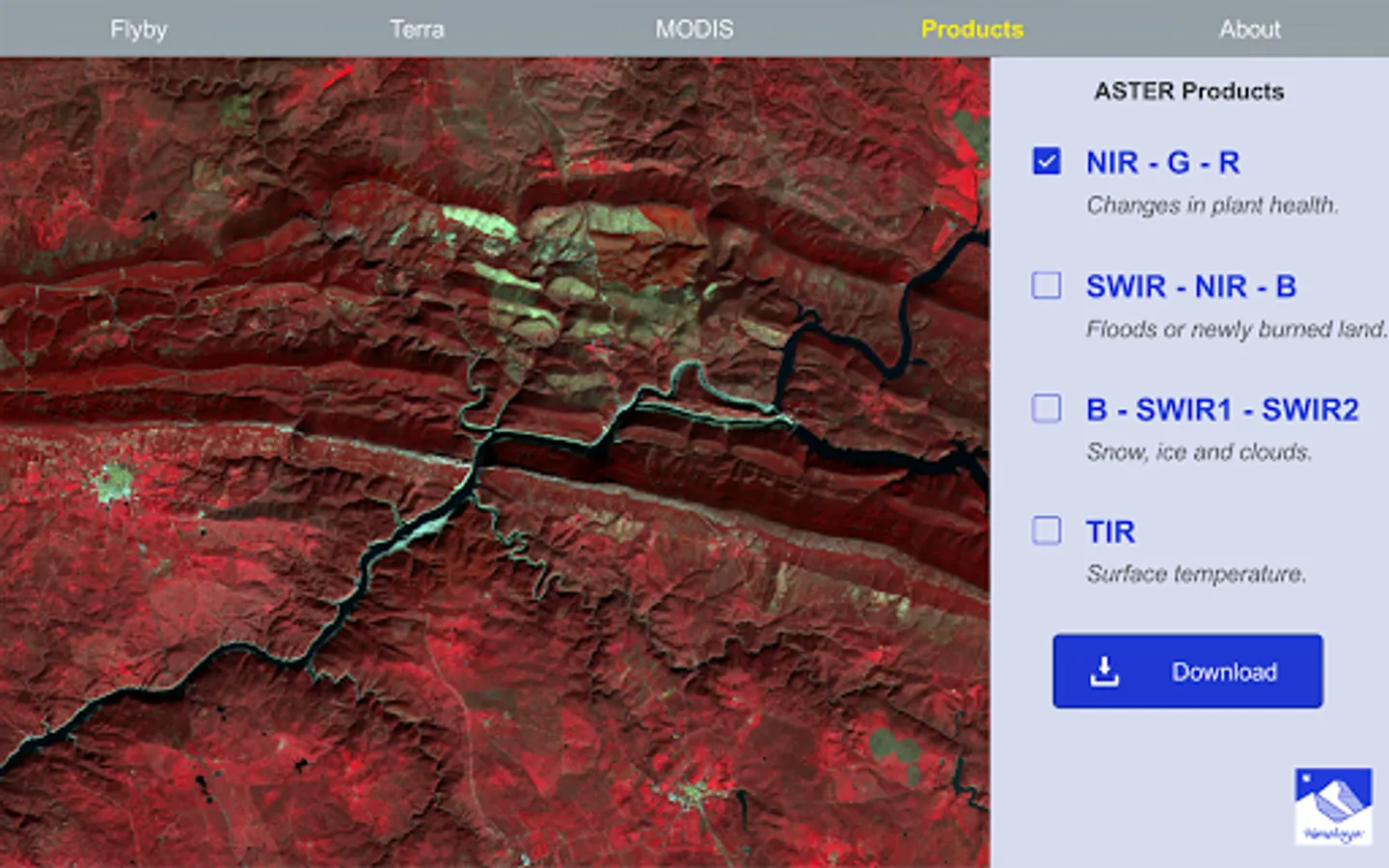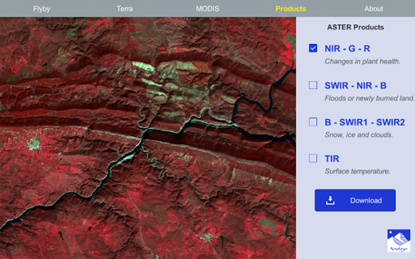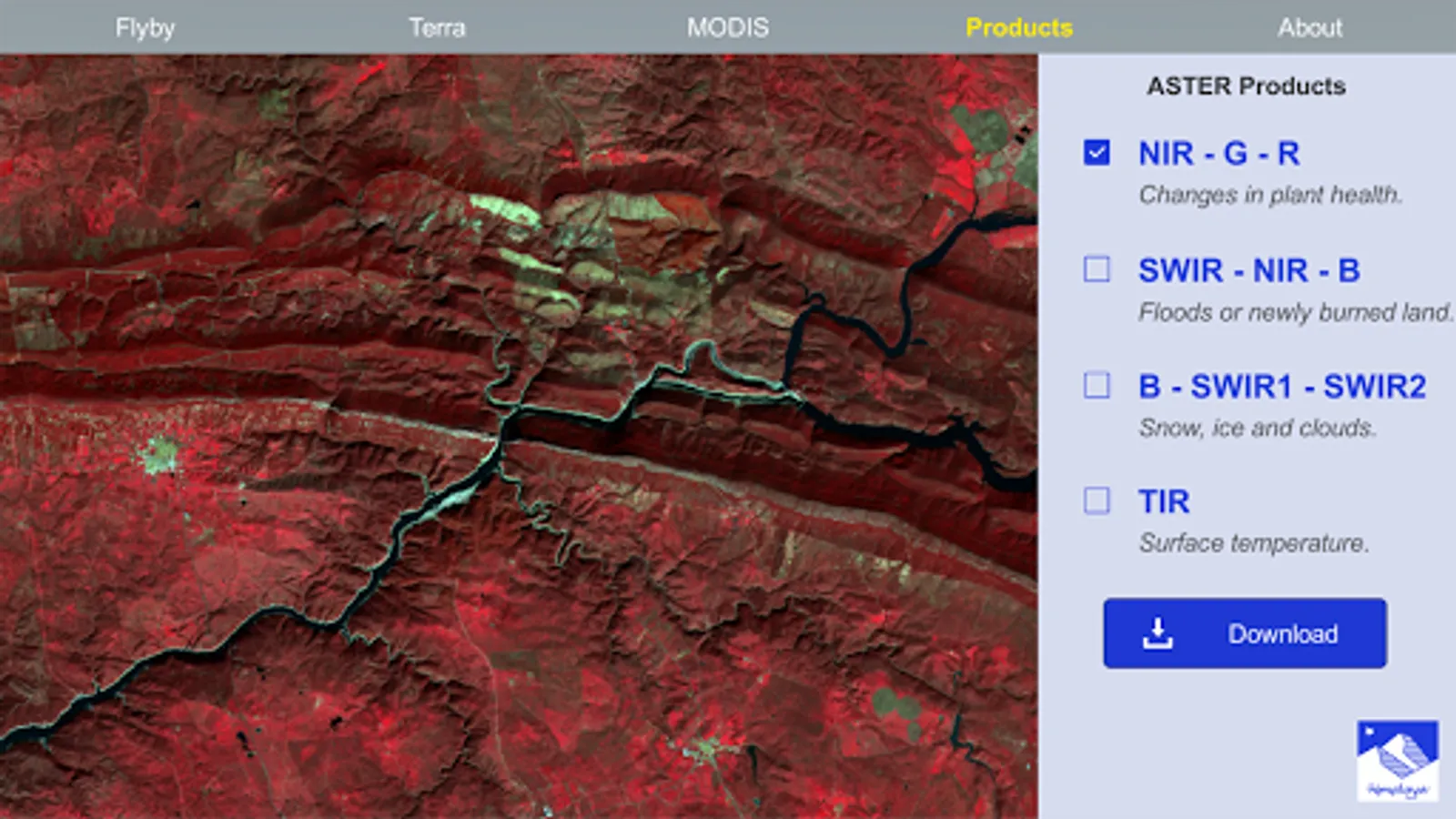 * Products: Visualization of processed data acquired by the Terra ASTER instrument. The area belongs to Monfragüe National Park (Spain), and it can be observed using different band combinations, which allow to highlight certain characteristics. The scene also presents a simulation of an user login procedure to download the original satellite products.