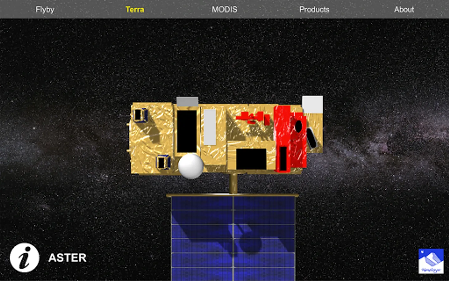 Global design of the NASA Terra satellite, represented along with its equipment and some data products. The application allows the user to interact with a 3D model of the NASA Terra satellite in order to learn the way it works, the payload and equipment present in the system, and the kind of data the satellite obtains to perform detailed observations of the Earth. Very useful to introduce in satellite development and EOS missions.
