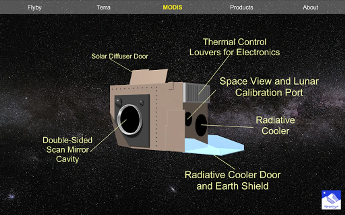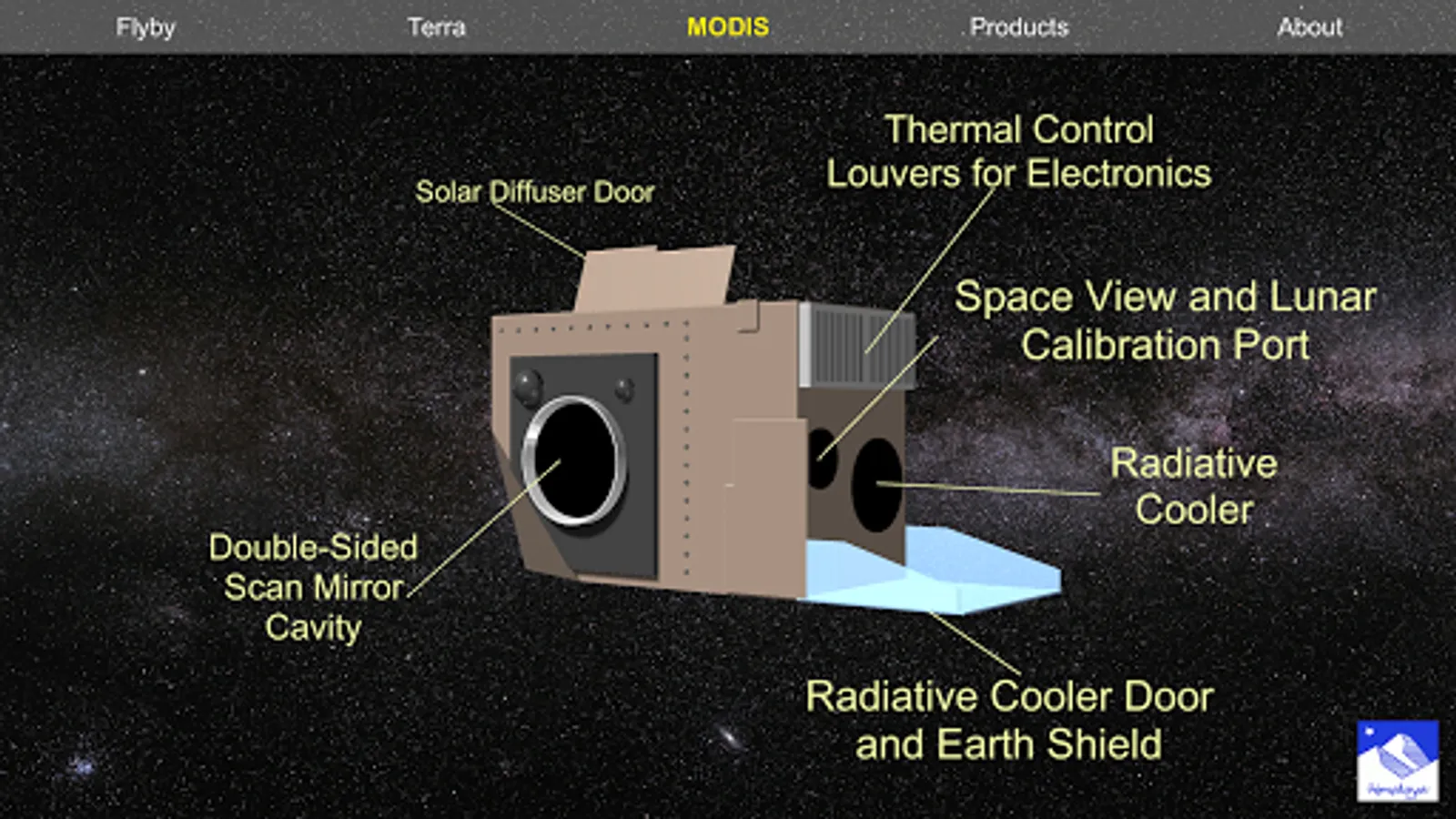 * MODIS: Simple 3D visualization of the Terra MODIS instrument, where every component has been identified.