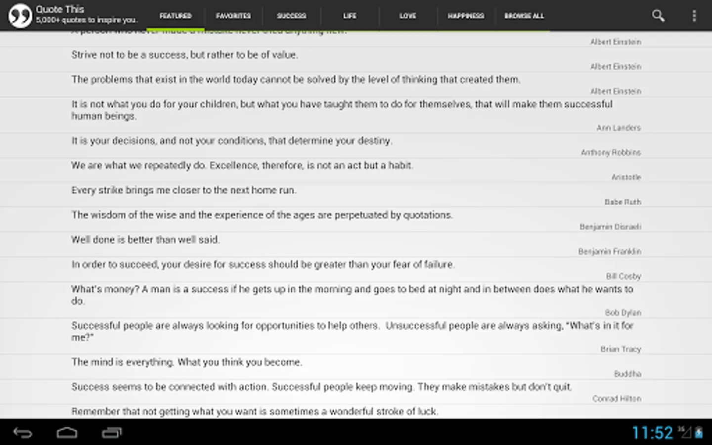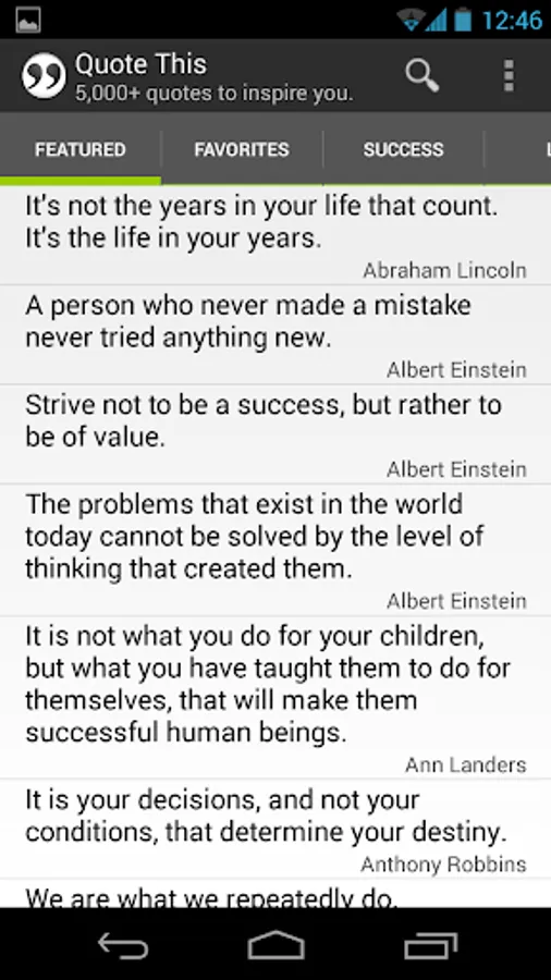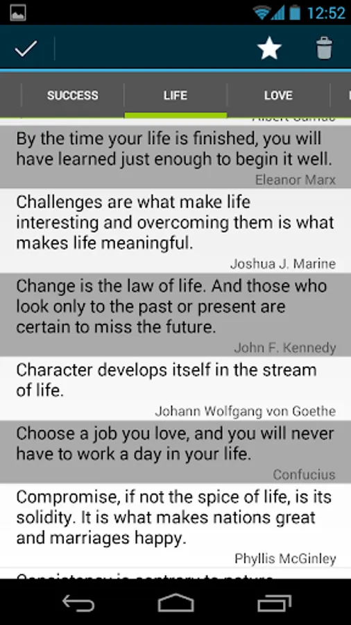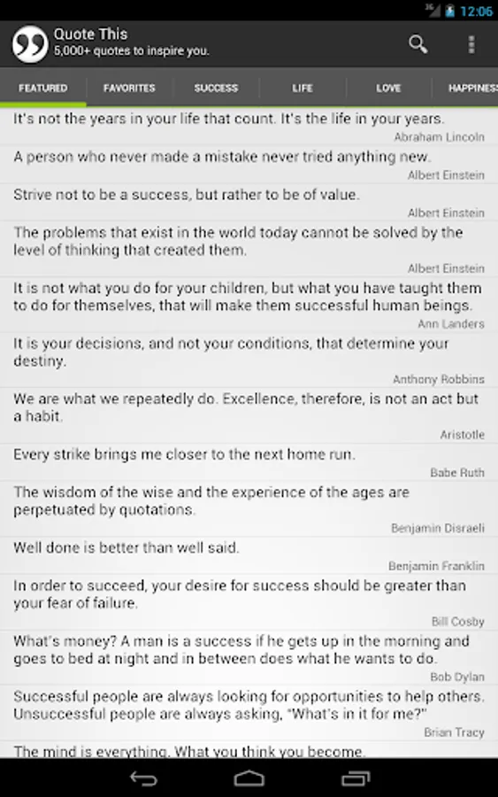 • Tabs – Quickly navigate to quotes about life, love, happiness & success by clicking the corresponding tab.