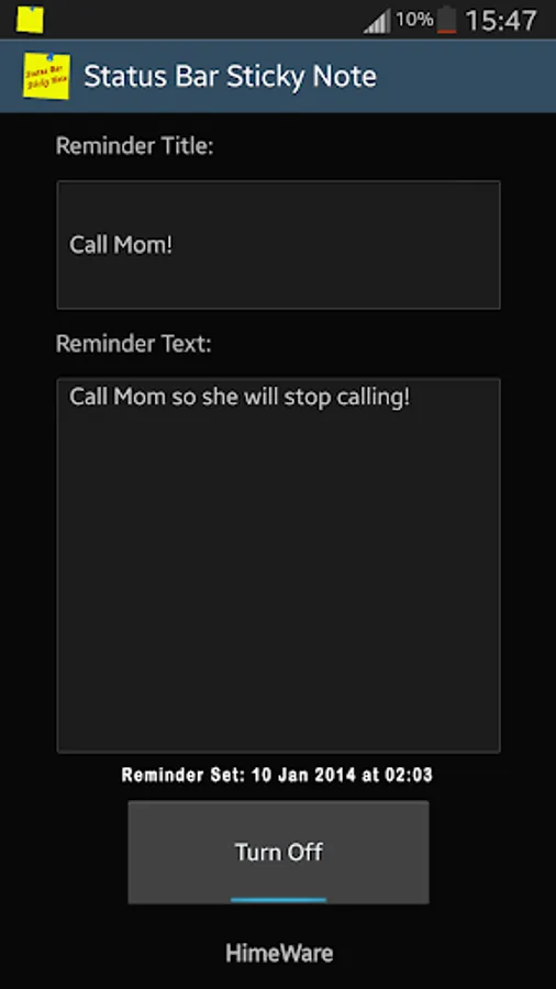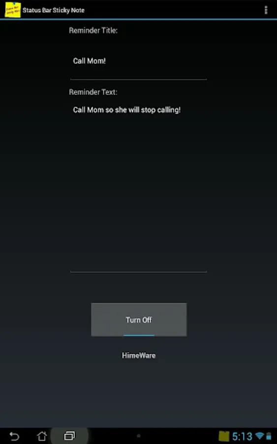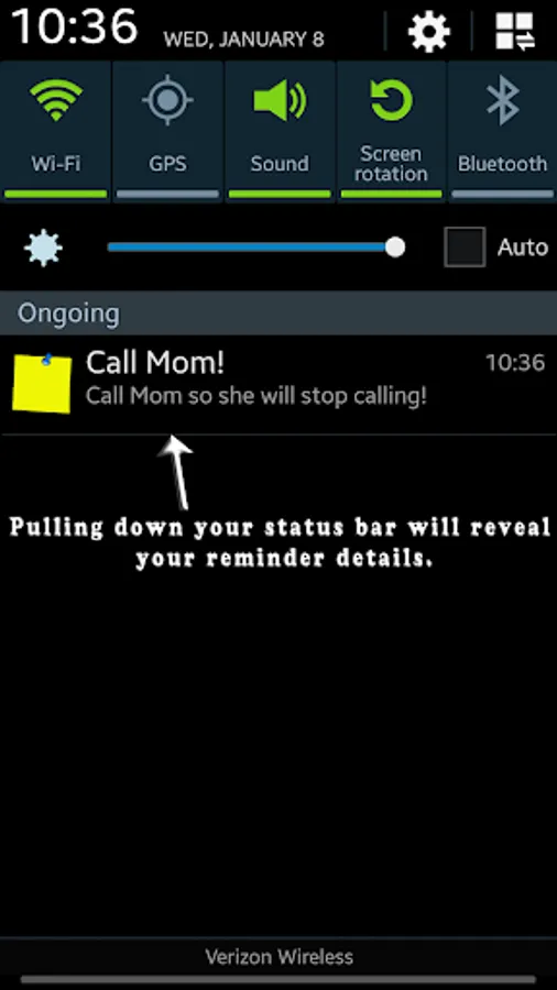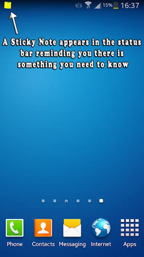 When Status Bar Sticky Note is activated a sticky note will appear in the status bar of your device. This acts as a visual reminder, reminding you that you have something you wanted to recall later. If you scroll down on your status bar you will be shown the sticky notes details.