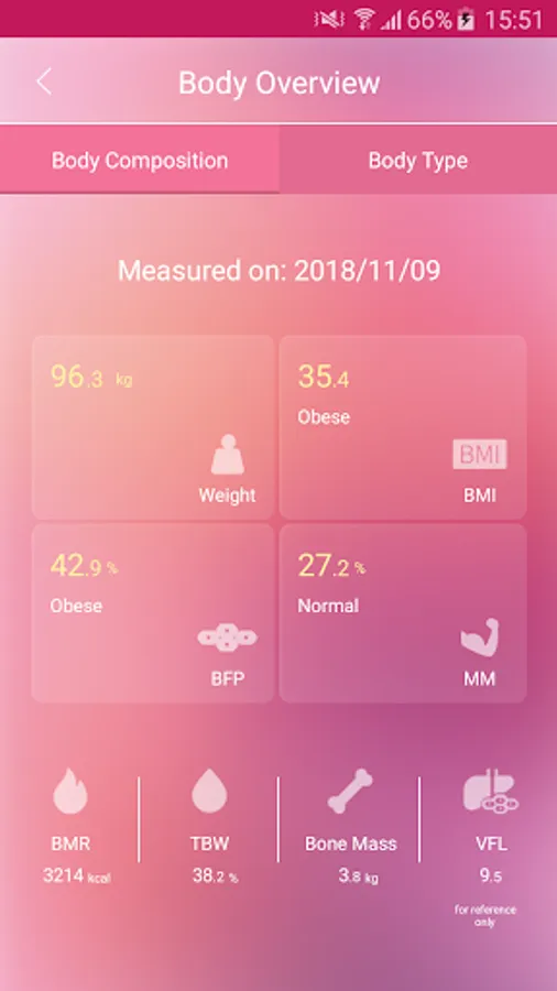 On the Body Overview page, you'll be able to review all measurements: weight, BMI, BFP, BMR, muscle mass, bone mass, TBW, and VFL. Select a specific factor to bring up a historical chart of your progress. A body type is also assigned, to be used as a reference when setting health and fitness goals.