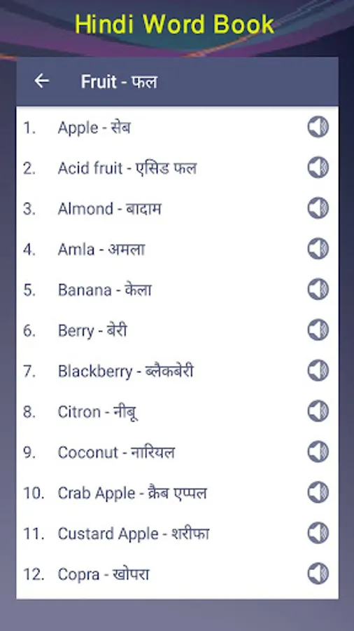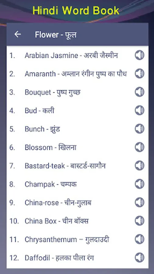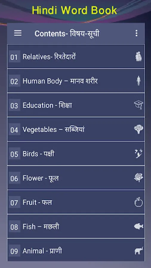 English to Hindi word book with sound button. You can learn them very easily. With the audio options all words has clear pronunciation and study them very easily. There is a pronunciation options on the app with that you can improve your speaking and listening of English