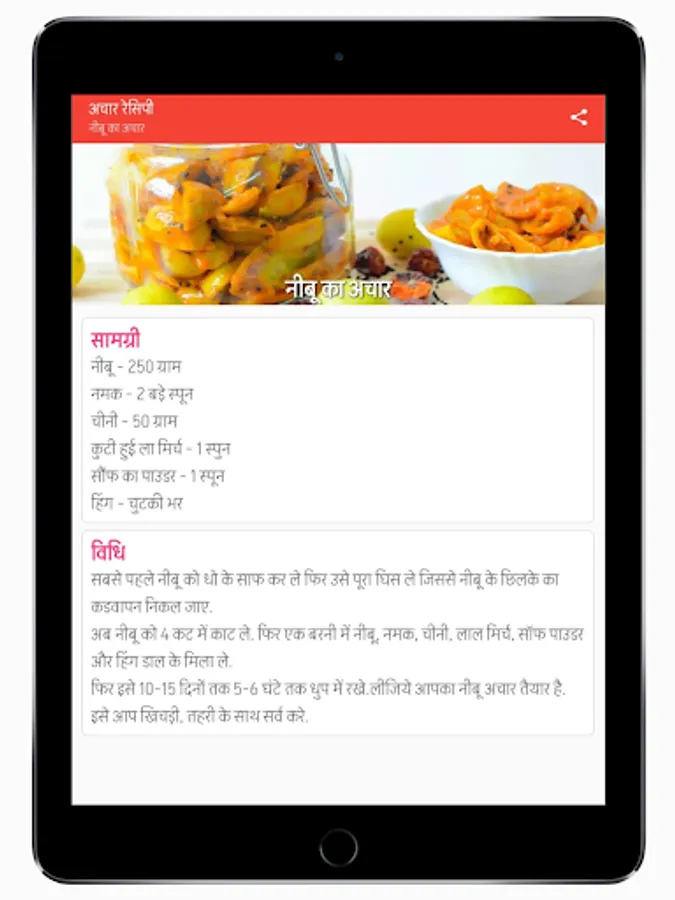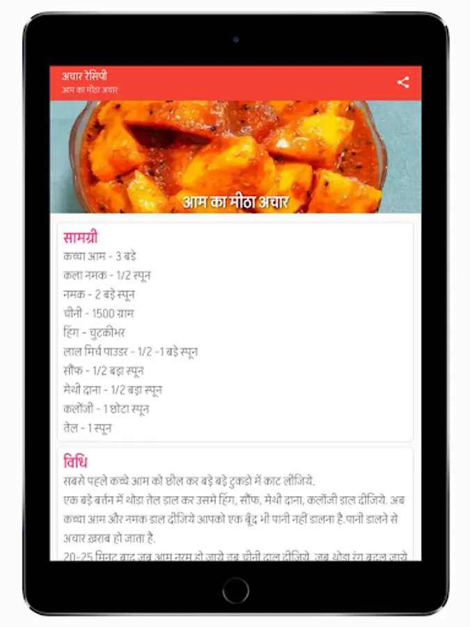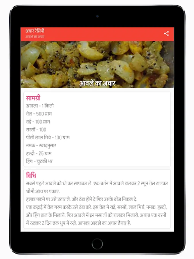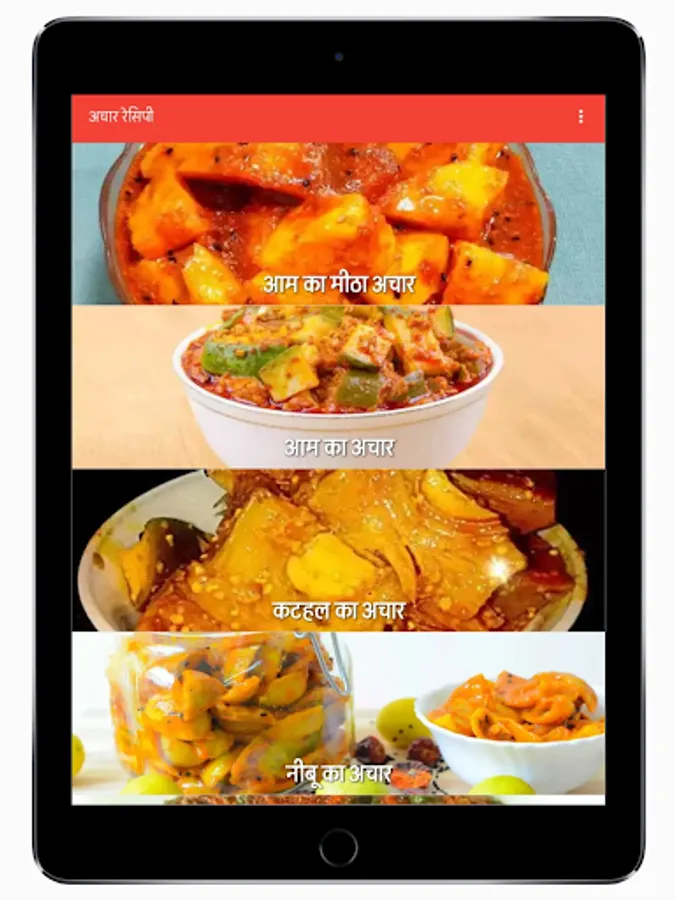 ● आचार रेसिपी इन हिंदी एप्लीकेशन का उपयोग करके अलग और अनोखे अंदाज में पारंपरिक अचार (आचार) तैयार करें।