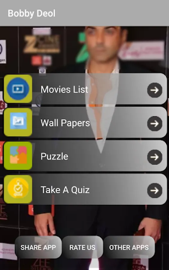 This Application display the information of Bobby Deol movies, it will not play any video or audio of his movies, It is a multi purpose application to Bobby Deol fans, App contains four options.