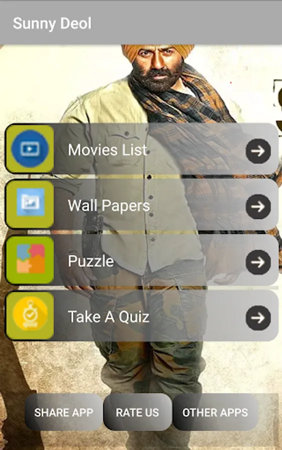 This Application display the information of sunny deol movies, it will not play any video or audio of his movies, It is a multi purpose application to sunny deol fans, App contains four options.